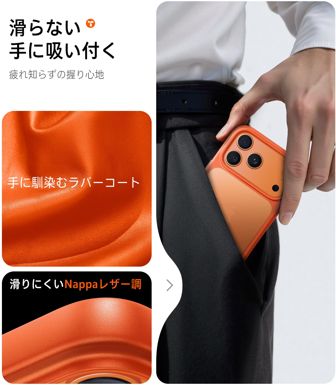 * 【防滑と快適さの完成形、7年の進化】NaPPaレザー調の微細なテクスチャーとラバー塗装を組み合わせ、手に自然に馴染む防滑性を実現。サラサラで滑らか、高級マウスのような上質な手触り。7年間の改良の末に辿り着いた、滑りにくさと心地よさの究極バランスです。手に握った瞬間から安心感と満足感が広がり、長時間の操作や持ち歩きでも疲れにくく、滑り落ちの不安から解放されます。(対応機種:For いPhone17 pro ケース)