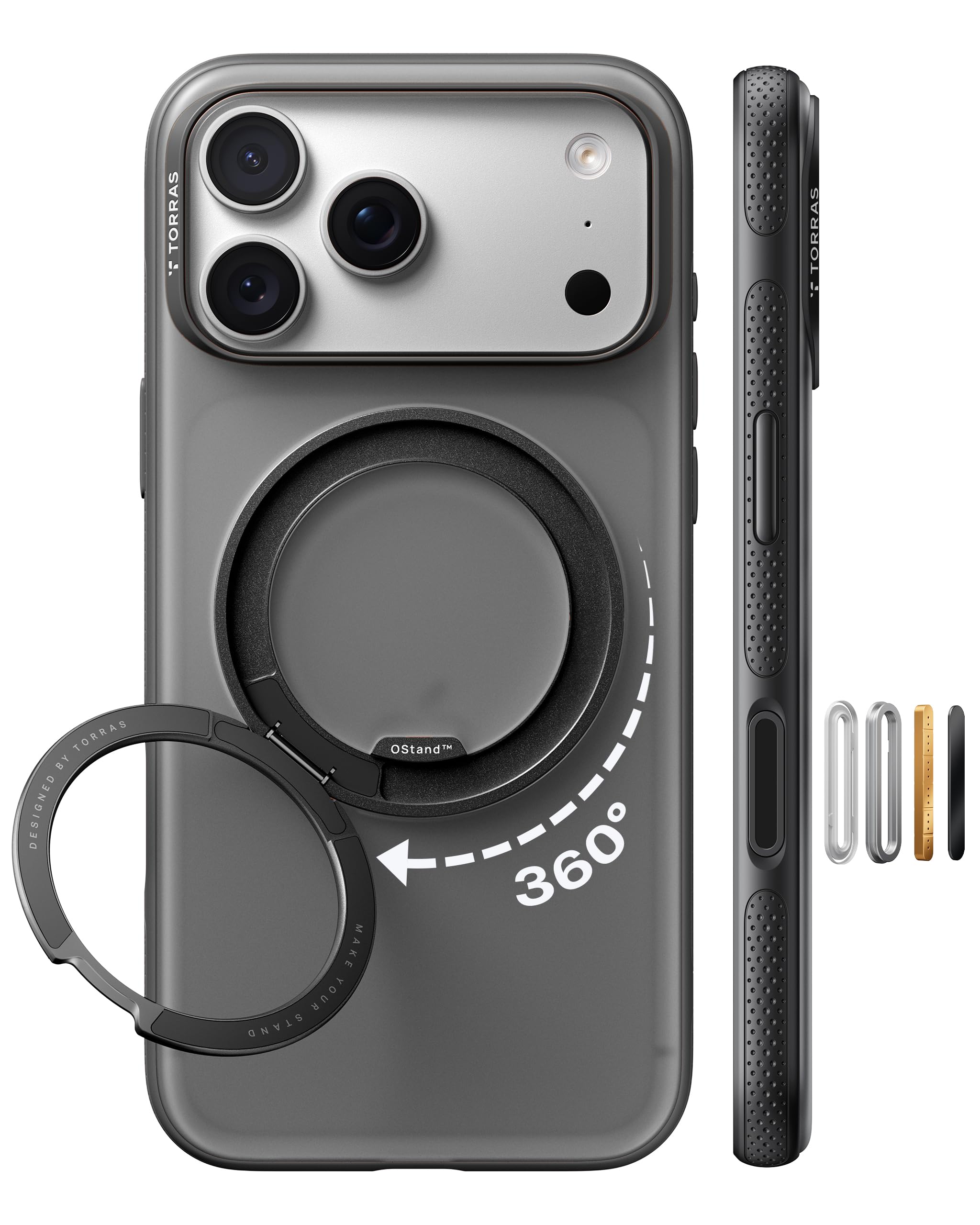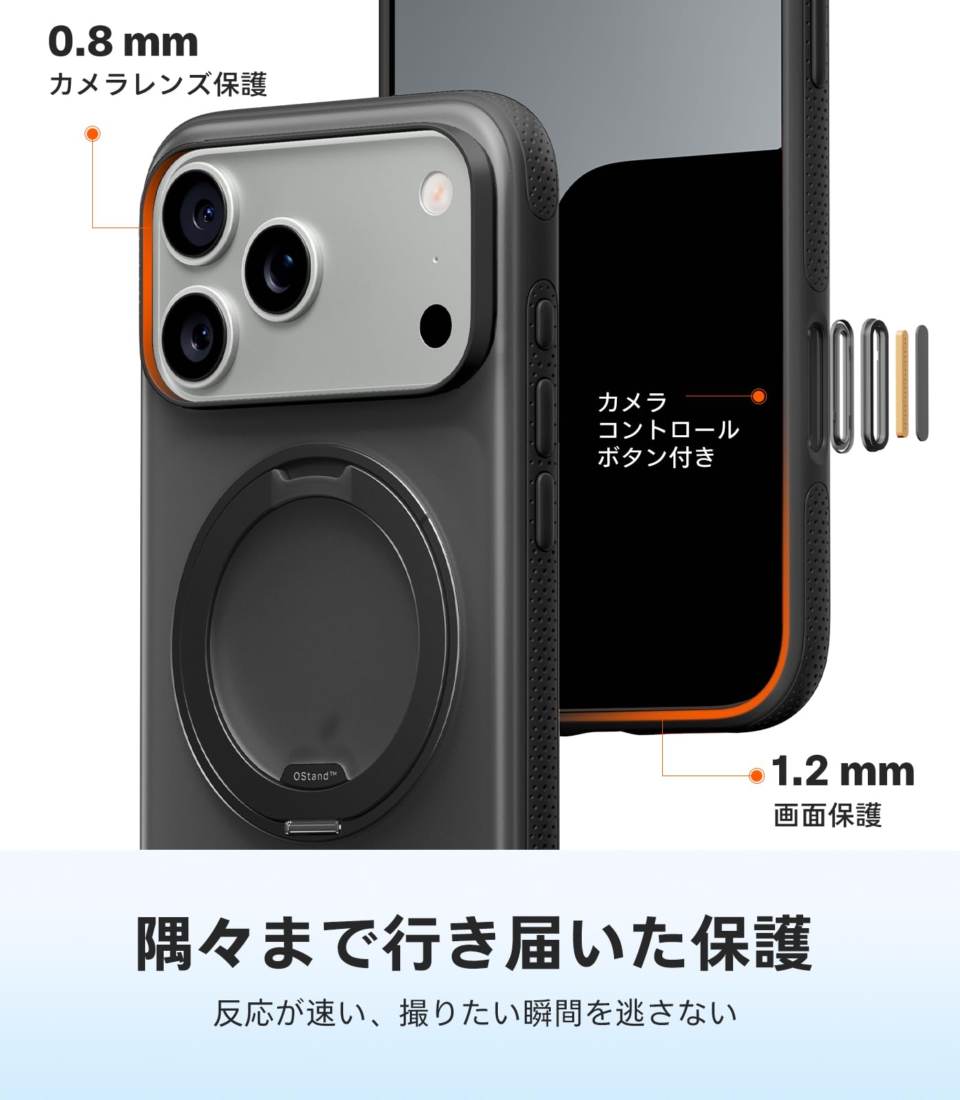 TORRAS iPhone 17 Pro 用ケース 【カチカチ・多機能360度回転スタンド】リング Ostand O3 Fitness MagSafe対応 米軍MIL規格耐衝撃 スタンド 指紋防止 黄変防止 カメラコントロールボタン付き ストラップホール 半透明 撮影/動画視聴/日常の記録 手のひらサイズの映像革命 ブラック