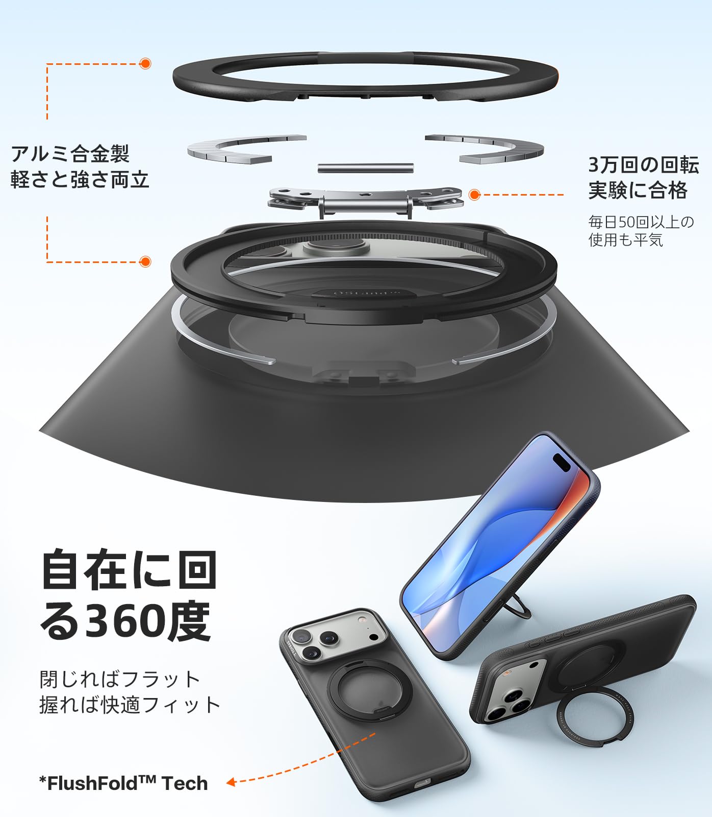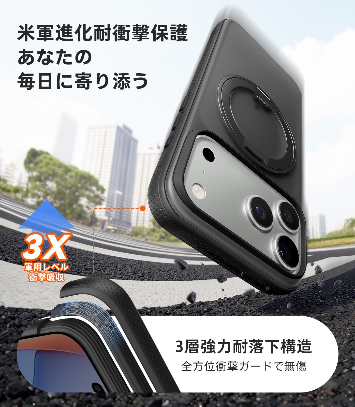 * 【新升級!!全方位 180° 展開スタンド】180° 全開可能にアップグレードしたスタンドを搭載,従来の展開角度制限を突破。スマホ落下時の衝撃や不意の押圧によるスタンド損傷の心配を完全解消し,日常使用での意外状況にも対応し,長期間安定した機能を保持できるため,安心して使用できます。対応機種:For iPhone 17 pro ケース