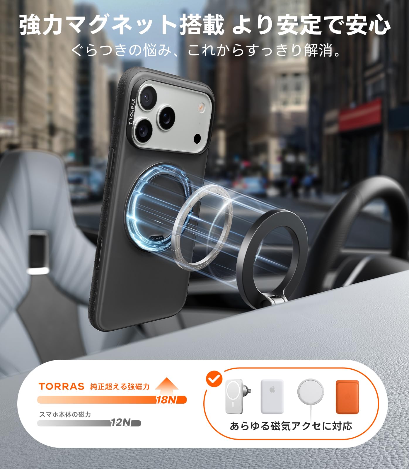 * 【SnapLock マグネット技術 —— 強固にロック、不安を払拭】TORRAS 独自のハルバッハアレイ技術が、iPhone 17 pro をカーマウントに強固に固定し、安心感のある「カチッ」という音を響かせます。N52SH ネオジム磁石を採用することで、オフロードの小道や都市部の凸凹した路面を走行する場合でも、ガタつくことなくしっかり吸着し —— 完全に安心してお使いいただけます。このマグネットケースは、ついに日常使いのマグネットアクセサリーとの接続性を完璧なものにしました。その安定性は、まるでケースの存在を忘れさせるほどです。対応機種:アイフォン17 pro ケース