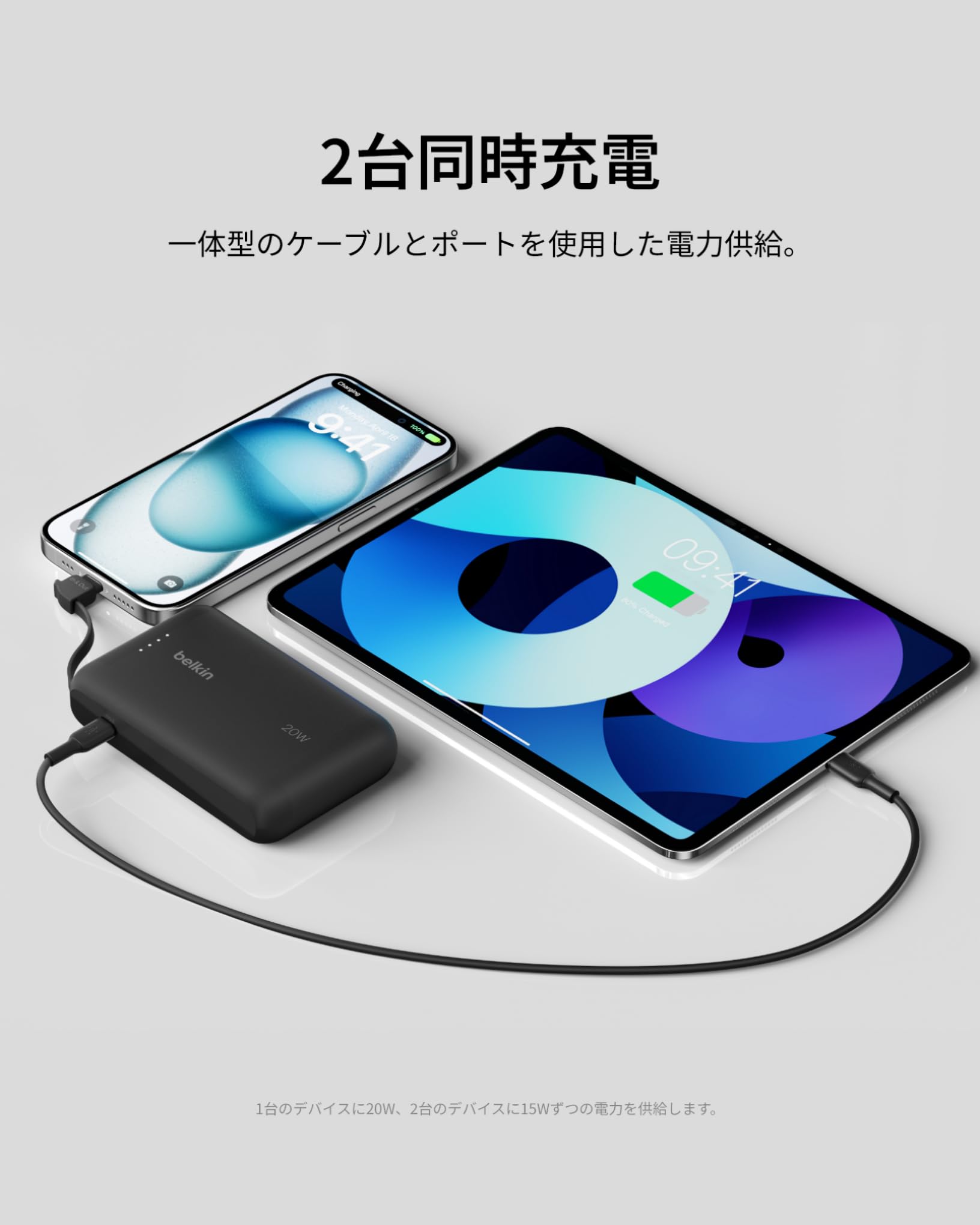 Belkin モバイルバッテリー(10000mAh 20W USB-Cケーブル内蔵) 3C対応 CCC 最大20W PD高速充電対応 PPS対応 iPhone 17,16~12対応 Androidスマホ対応 2台同時充電 PSE認証 軽量&コンパクト 機内持込可能 アウトドア/災害/緊急用の便利グッズ メーカー保証2年 ブラック BPB021fqBK