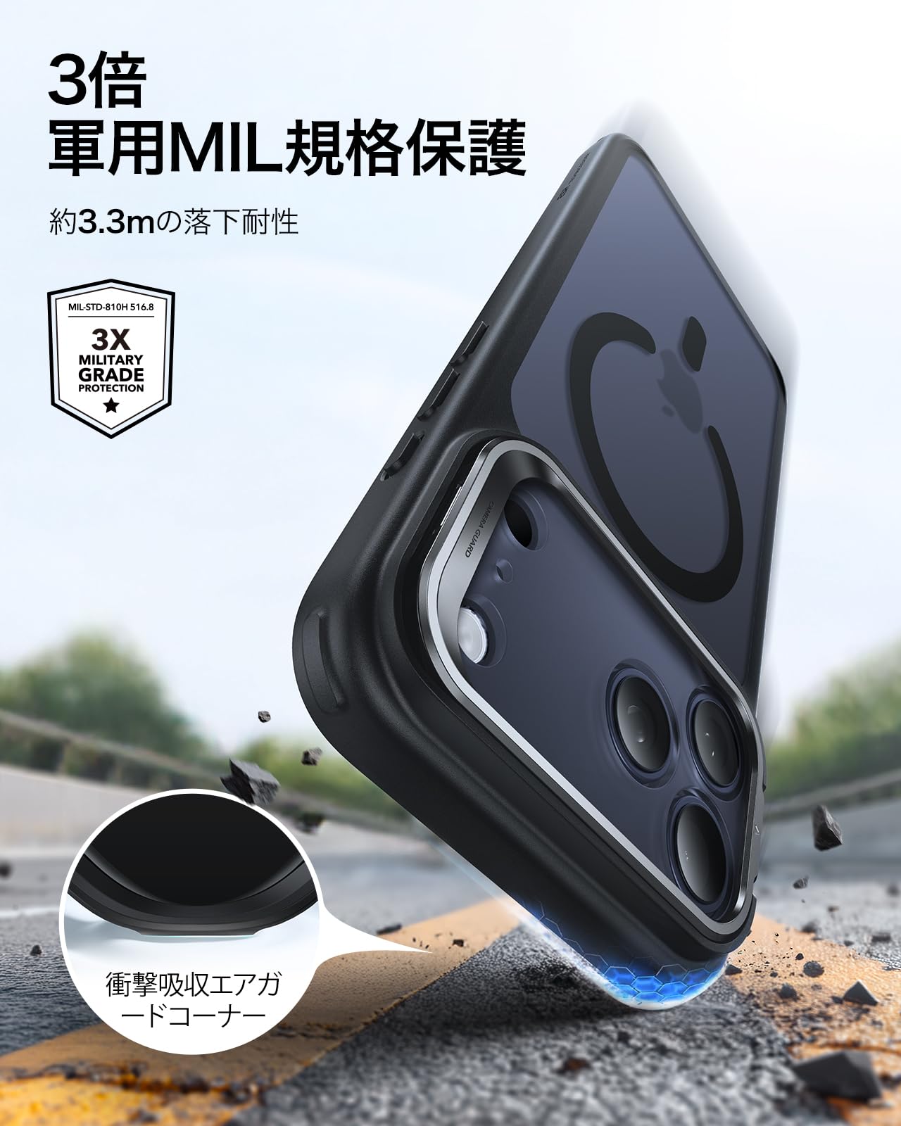 【デザイン受賞シリーズ!】ESR iPhone 17 Pro ケース MagSafe対応 3倍米軍MIL規格 カメラコントロールカバー 隠れスタンド 調整可能 2層構造カメラ保護 ワイヤレス充電 エアガードコーナー 耐衝撃 傷防止 軽量 マグネットスマホケース 高耐久性 Qi2.2対応 最大25W高速充電 いphone17pro ケース iphone17Pro用Classicシリーズ ブラック