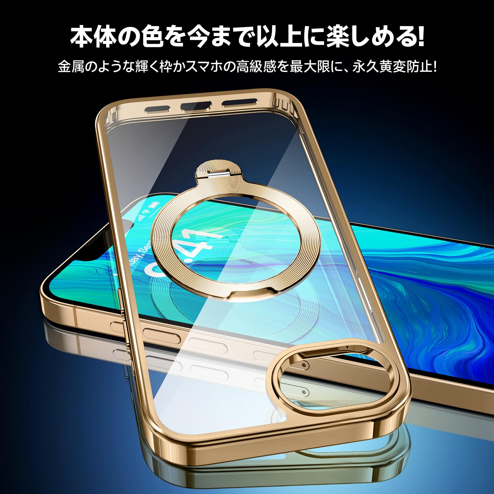 【三重保護セット!上品なメタリック光沢】OYR iPhone 16e 用 クリア ケース Magsafe 対応[360°回転CD スタンド・10 万回開閉テスト][メッキバンパー・iPhone専属色][カメラ保護とガラスフィルム付き]ストラップホール付き マグセーフ アイホン16eケース マホケース16e 人気 米軍MIL規格取得・耐衝撃(6.1インチ・ゴールド)