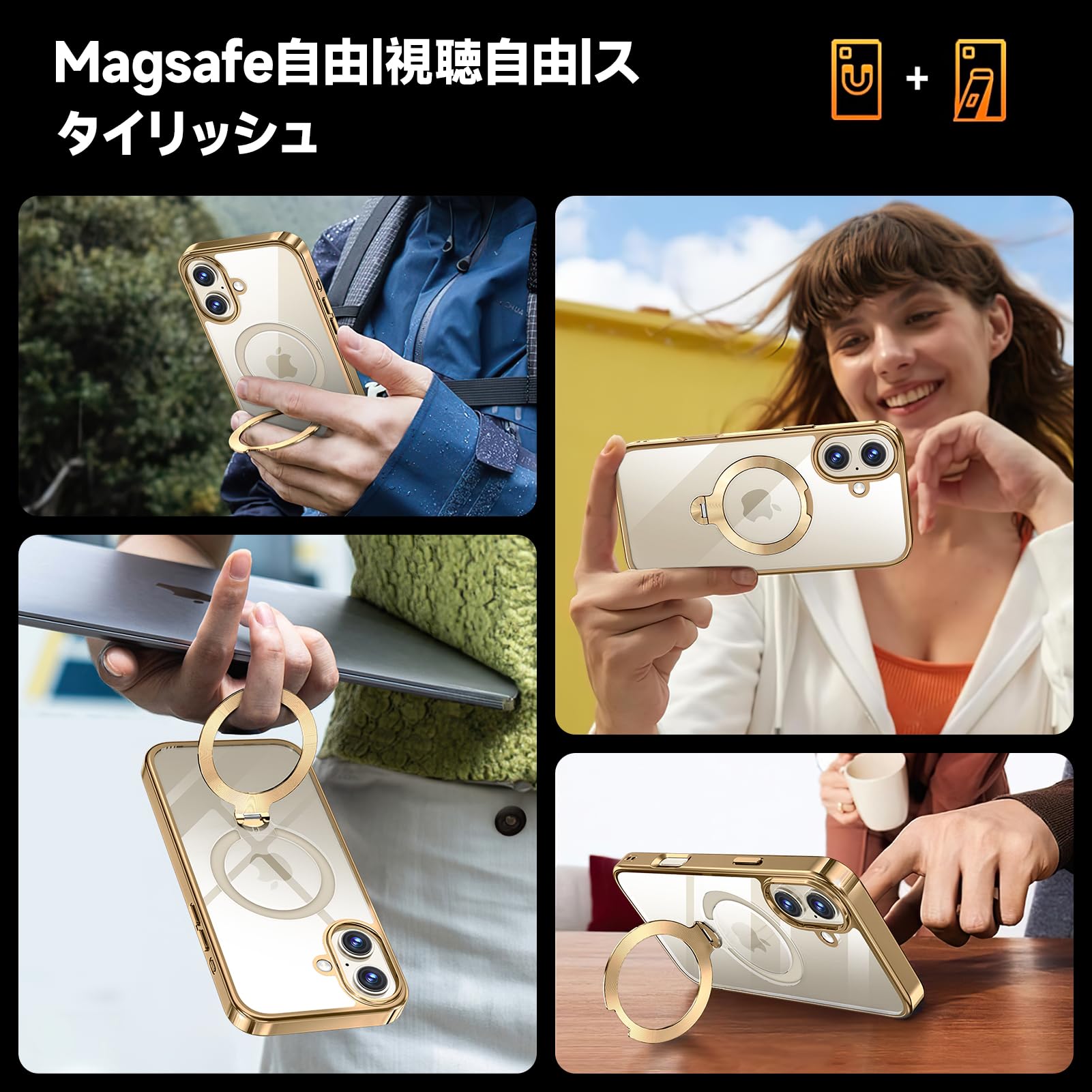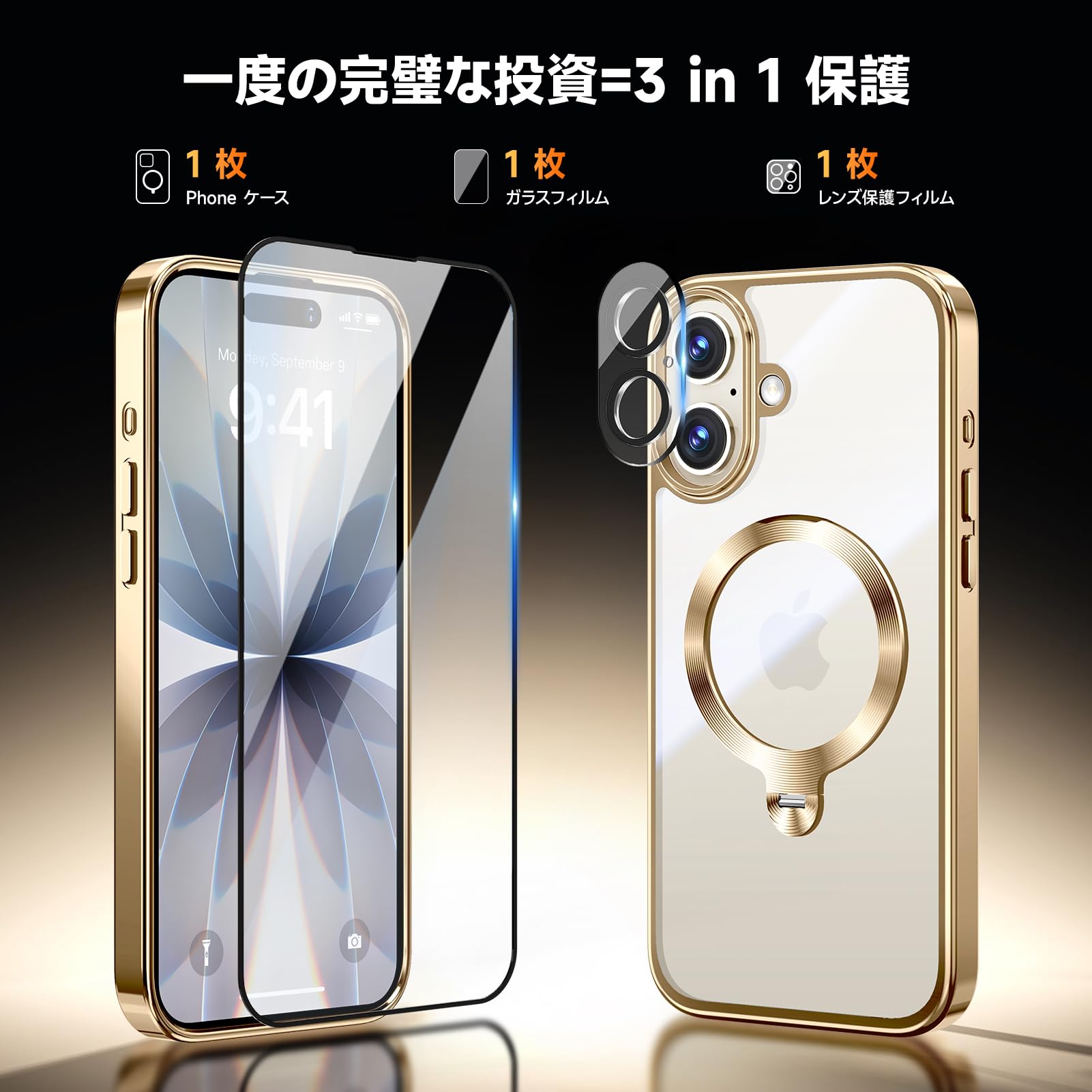 【三重保護セット!上品なメタリック光沢】OYR iPhone 17用クリア ケース Magsafe 対応[360°回転CD スタンド・10 万回開閉テスト][メッキバンパー・iPhone専属色][カメラ保護とガラスフィルム付き]ストラップホール付き マグセーフ アイホン17ケース マホケース17 人気 米軍MIL規格取得・耐衝撃(6.3インチ・ゴールド)