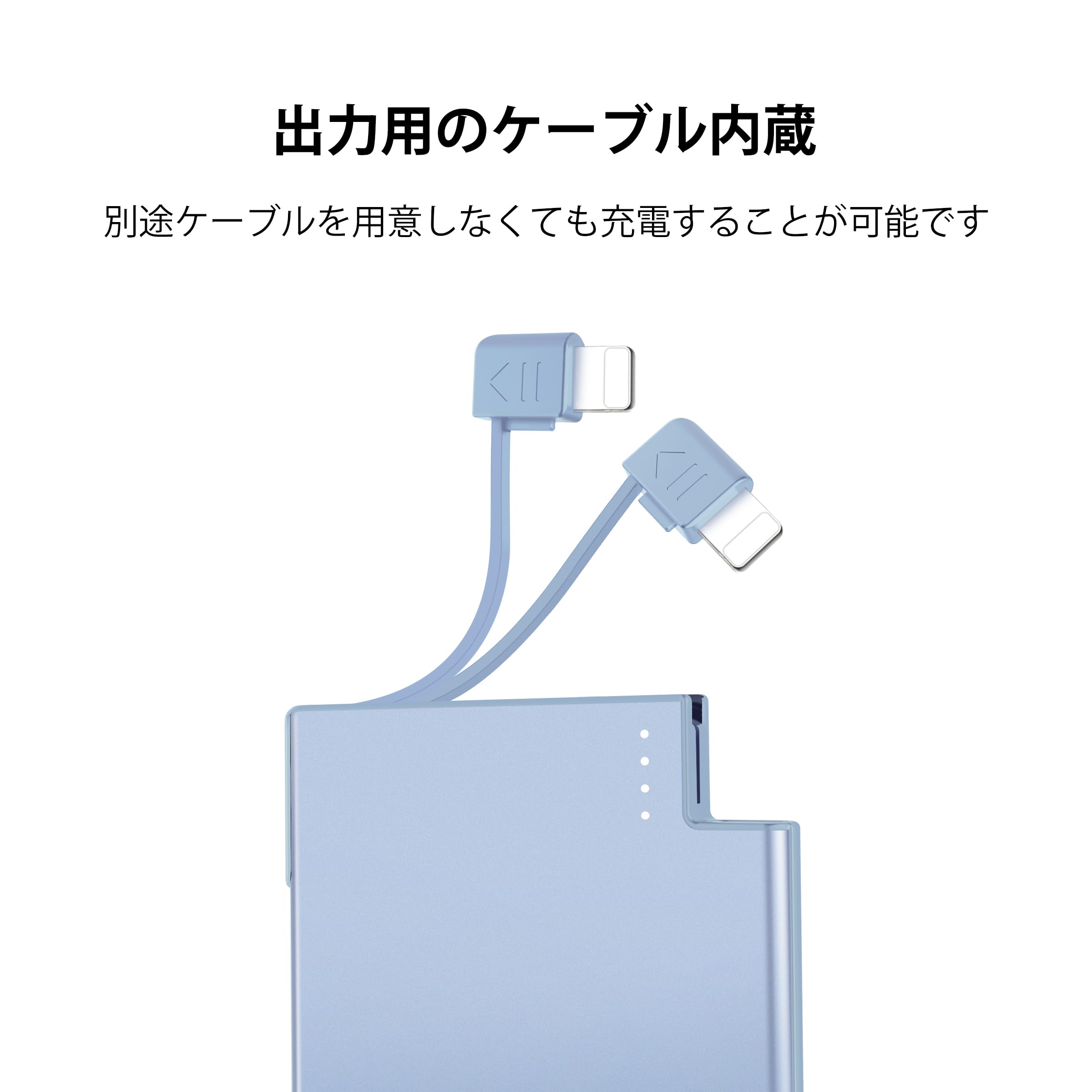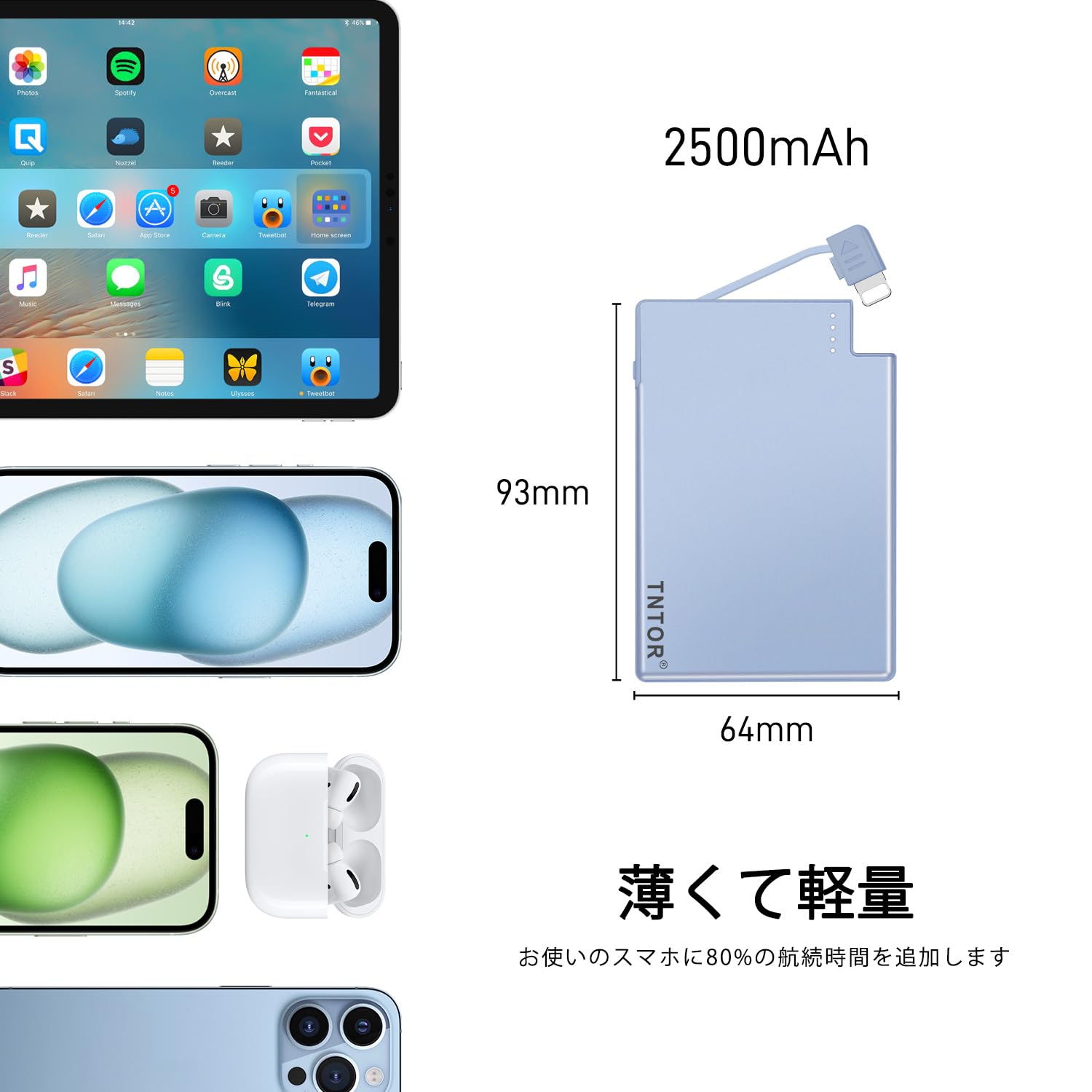 TNTOR ミニ 超薄型 モバイルバッテリー iPhone 14/13/12対応 Lightningケーブル内蔵 わずか4.5mm 軽量小型 MFi認証 ポータブルバッテリー 2500mAh 充電コード内蔵 専用充電器 持ち運び便利 【PSE認証済】 水色