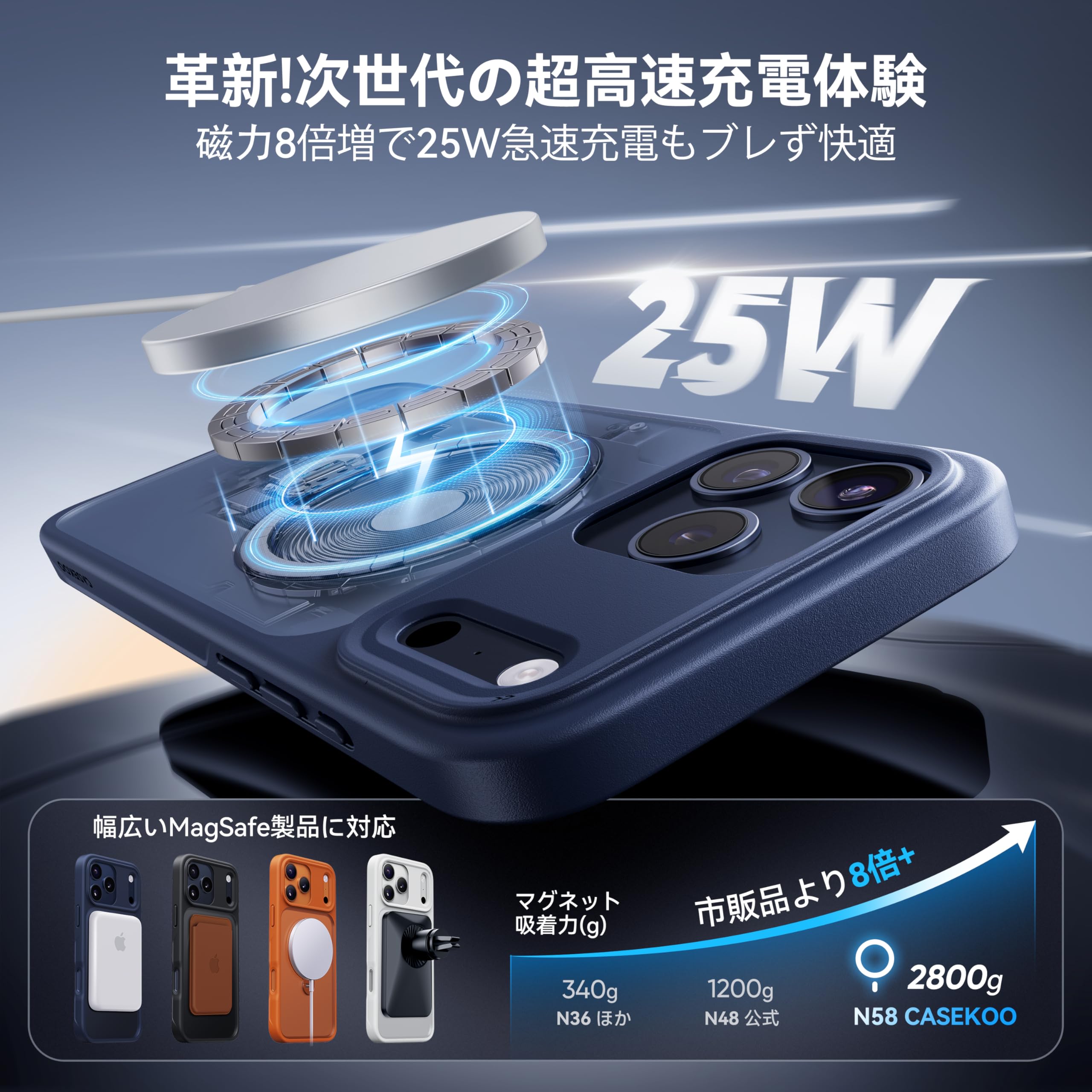 * 【MagSafe対応を極めた、業界最強18N磁力】 位置合わせ不要、装着した瞬間、車載ホルダーやウォレットなどのMagSafe対応アクセがピタッと吸着。独自のHalbach配列+n58グレード磁石により、業界最強クラス18Nの吸着力を実現、消磁や信号干渉の心配も一切なし。さらに、360°定点回転設計だから、車内での揺れや急ブレーキでもズレず・回らず・傾かない。視線がブレず、運転中のナビ確認も安全そのもの。両面マグネット構造で、冷蔵庫やロッカーにもぴたり。レシピ確認も動画視聴も、完全ハンズフリー革命。※設置面の素材によって磁力が弱まる場合があります。対応機種:いphone17promaxケース magsafe対応