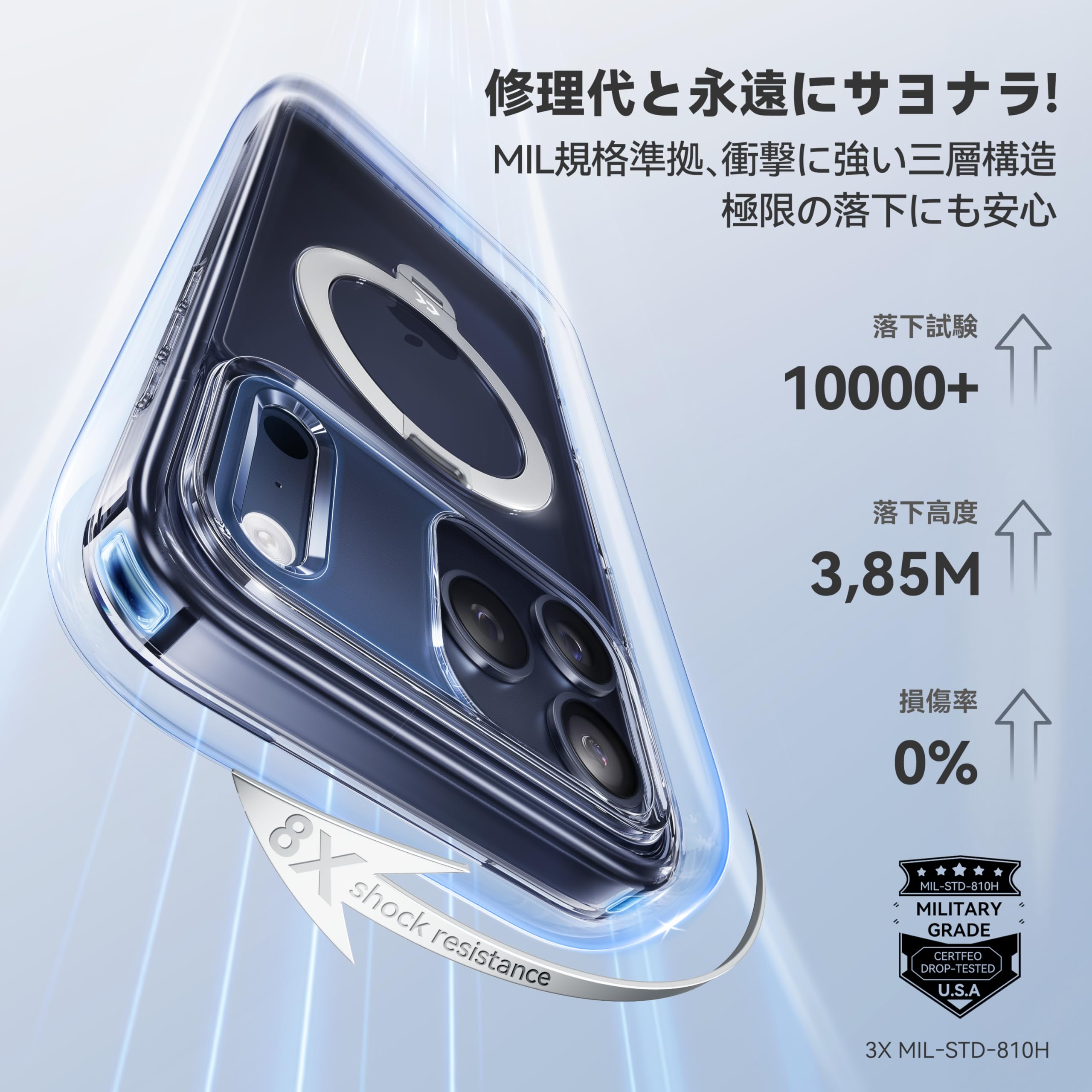 * 【全方位ガード!驚異の耐衝撃性】電車で押されて手が滑ったときも、公園で子どもが振り回して落とされたときも安心。新型iPhone17に合わせて専用設計された本モデルは、四隅を守るAir-Shock 5.0をさらに強化し、三層構造のプロテクションで端末全体を包み込む設計に進化。3.85mからの落下試験を15,000回クリア。カメラ周囲2.5mm・画面周囲1.5mmの高低差設計と、独自の半開口カメラガードで、17シリーズの史上最大レンズを美しく、接地時の傷や摩耗からもしっかり保護。車載マグネットホルダーやワイヤレス充電にも対応。日常の「うっかり」からアクティブなアウトドアまで、頼れるタフさを実感。 米軍規格MIL-STD-810H認証取得(認証番号:GZMR240702237705)。対応機種:iphone17 pro ケース