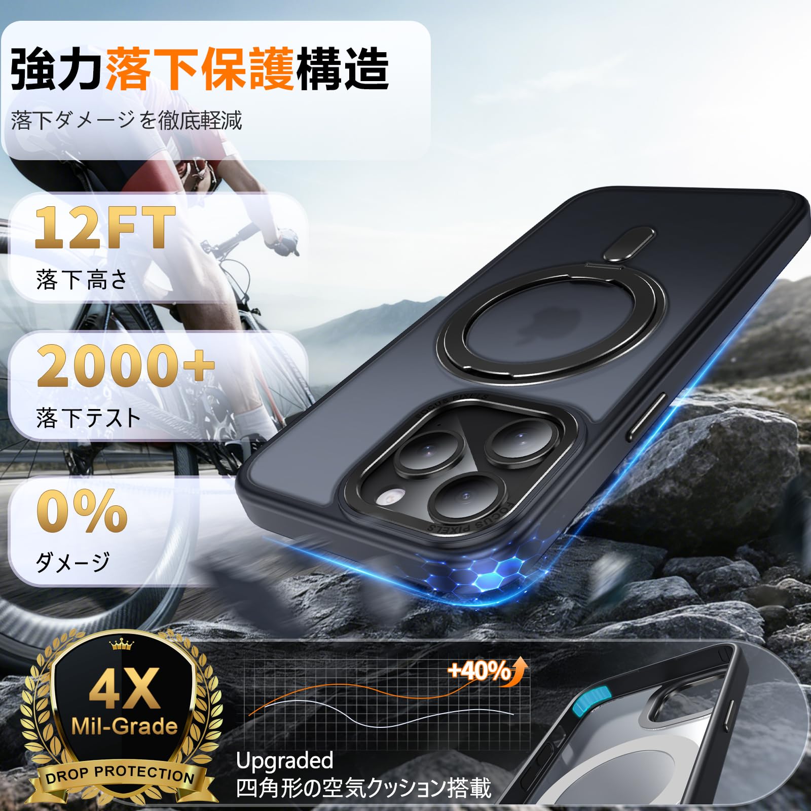 * 「全方位耐衝撃保護」:背面には 高硬度ポリカーボネート(PC)+ TPUソフトバンパー を採用し、 4層緩衝構造 によって落下時の衝撃を最大 95%吸収。カメラ部分と画面周囲は 約1.5mmの隆起設計 により擦り傷を防止。さらに金属製のカメラ保護フレーム付きで、机などの平面に置いても安心。