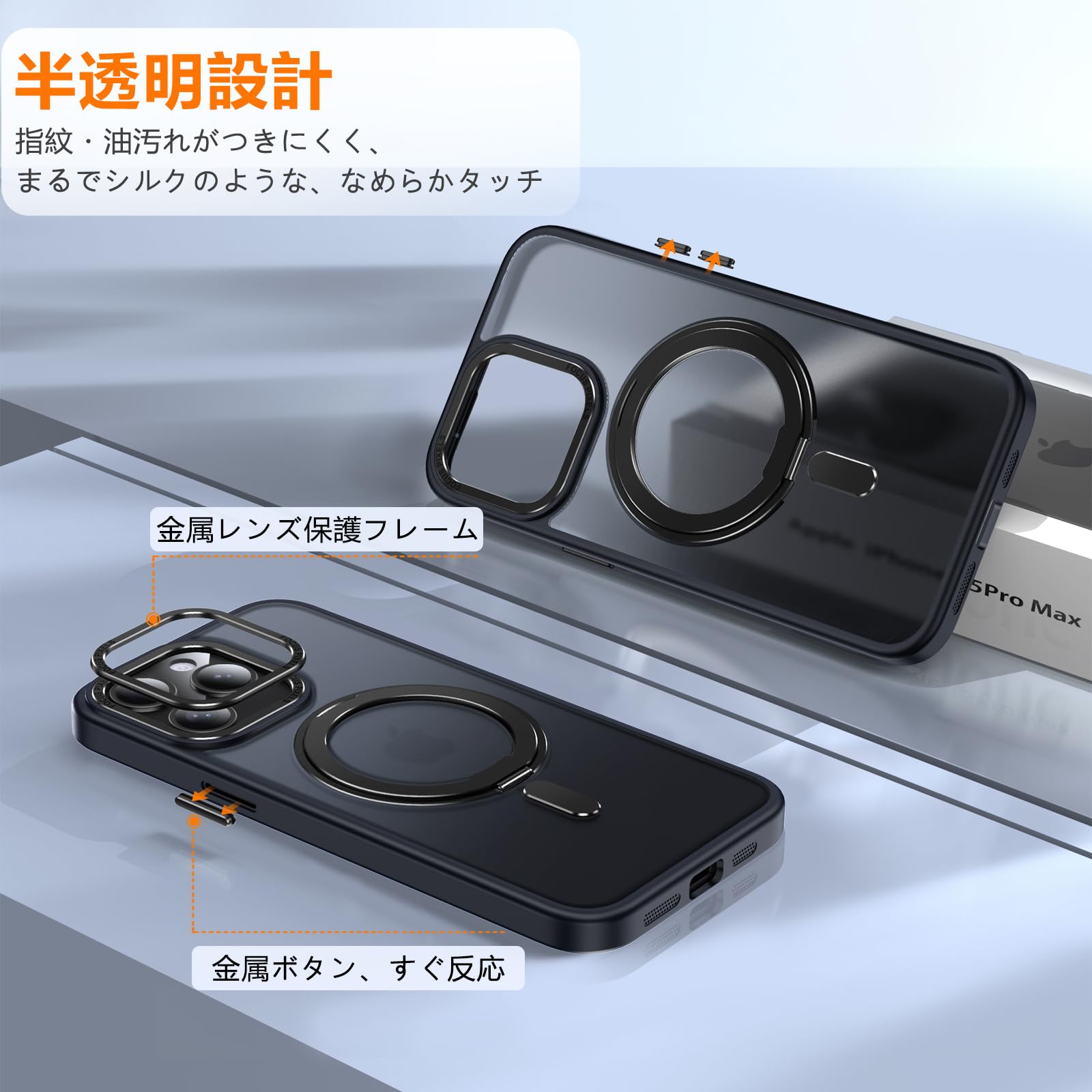 * 「全方位耐衝撃保護」:背面には 高硬度ポリカーボネート(PC)+ TPUソフトバンパー を採用し、 4層緩衝構造 によって落下時の衝撃を最大 95%吸収。カメラ部分と画面周囲は 約1.5mmの隆起設計 により擦り傷を防止。さらに金属製のカメラ保護フレーム付きで、机などの平面に置いても安心。