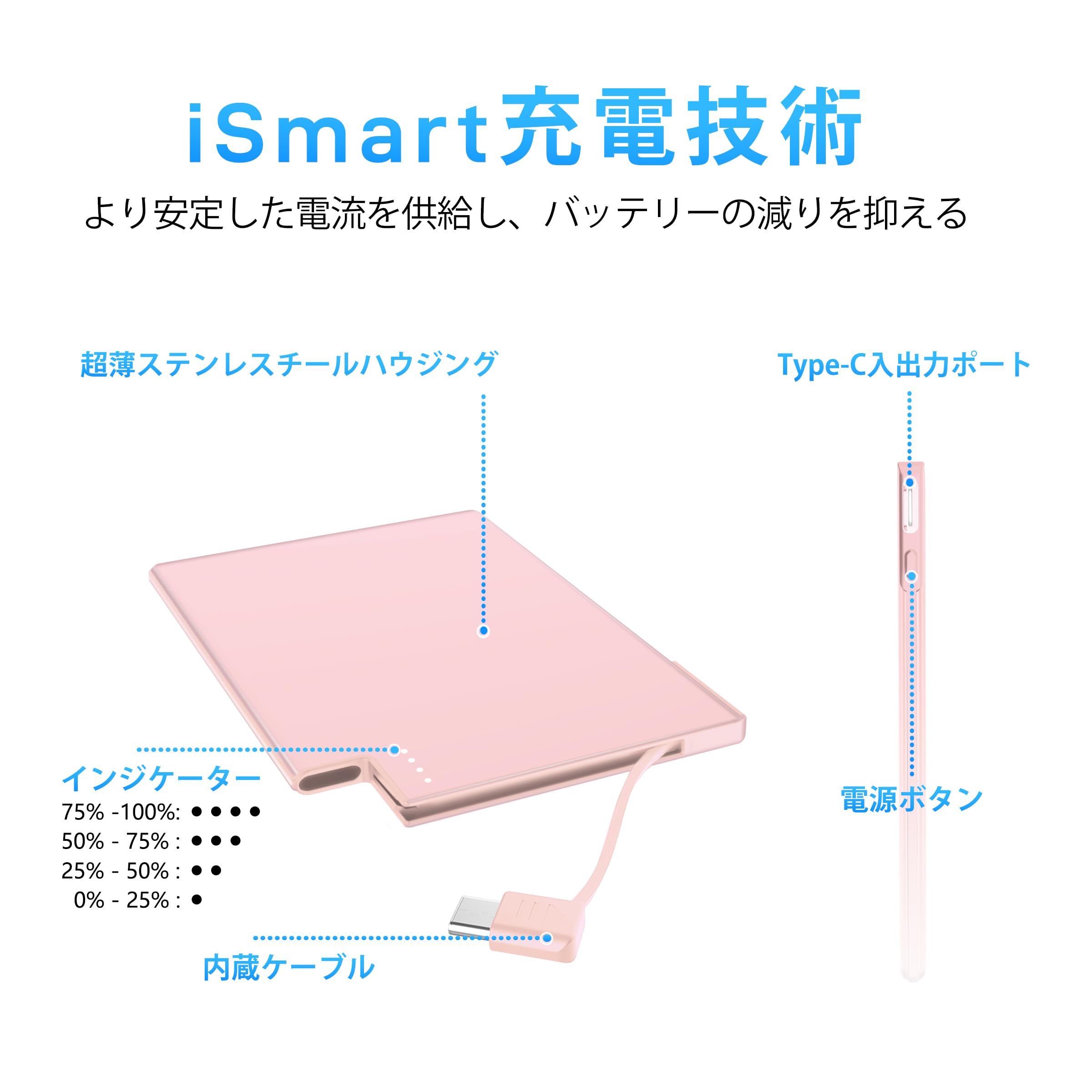 * タイプCケーブル内蔵:内蔵されたケーブルは出力専用のため、別途ケーブルを用意する必要がなく、すぐに充電が可能です。手軽に持ち運べ、まるで財布からカードを取り出すような感覚で使えるモバイルバッテリーです。外出先でもバッテリー切れの心配がなく、iPhoneをいつでも簡単に充電できるので、身軽さと安心感を同時に提供します。