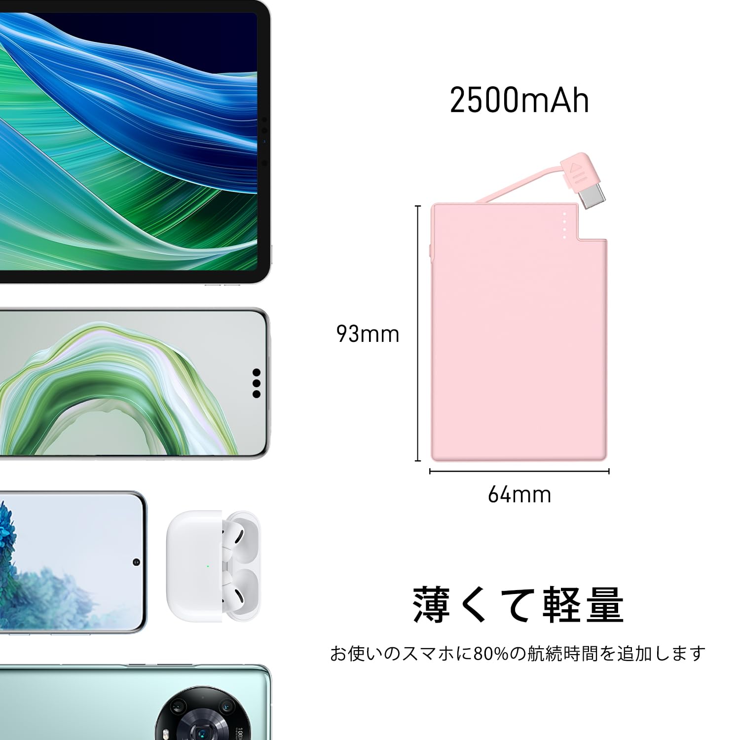 TNTOR モバイルバッテリー 軽量 小型 iPhone 17/16/15Proに対応 タイプc充電器 2500mAh 【わずか4.5mm・約71g】 財布入れ可能 スマホバッテリー Type-Cケーブル内蔵 Android機種対応 携帯充電器 コンパクト 超軽量 超薄型 機内持ち込み可能 旅行/出張/アウトドア/停電対策/防災 【PSE認証済】ピンク