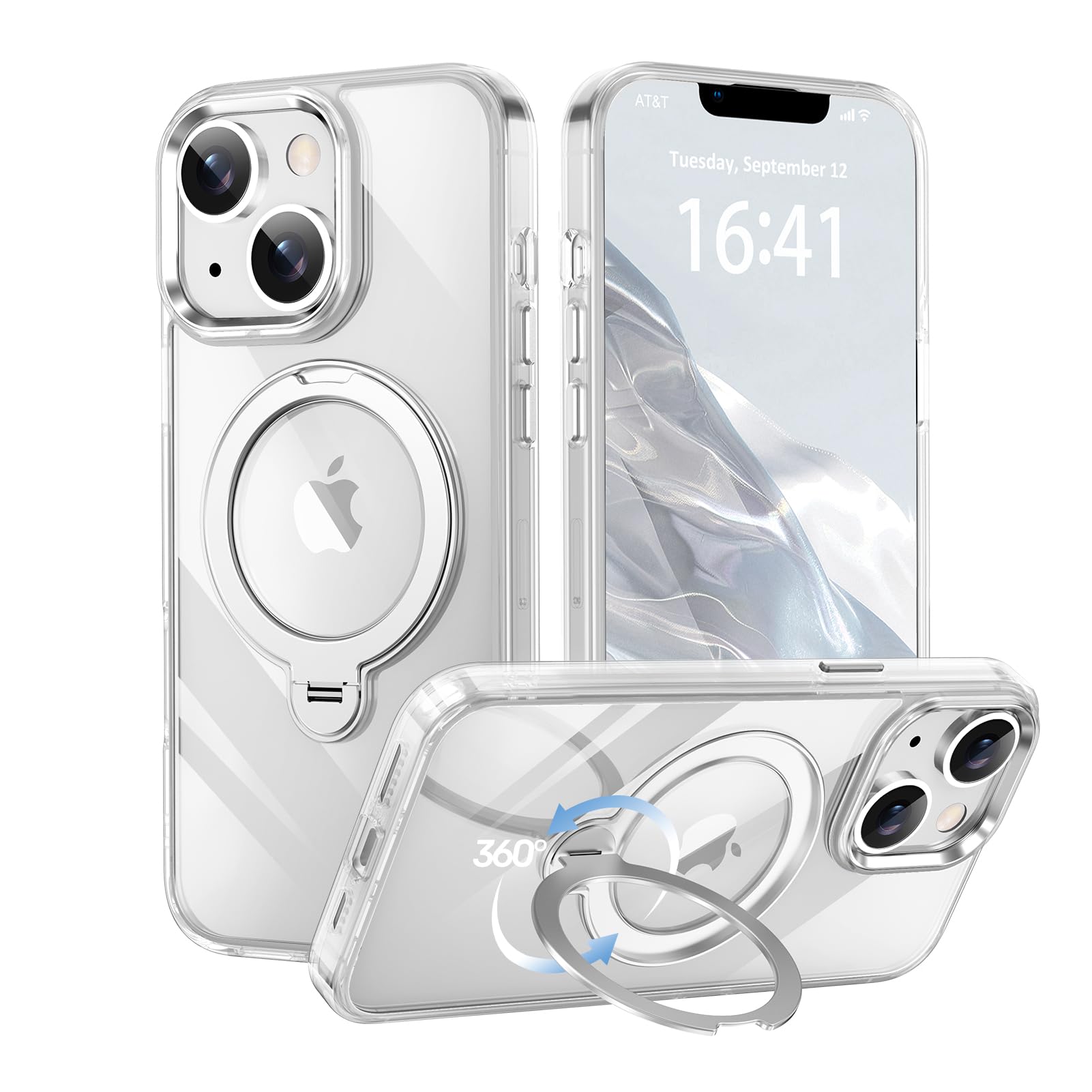 【透き通る上質感・多機能360°回転スタンド】KMAMBNG iPhone13 用 ケース Magsafe対応 iPhone14 用 ケース【耐衝撃・金属感・真空メッキ・黄変防止・ストラップホール付き】縦横両立 角度自在 調整可能 磁吸機能で ワイヤレス充電対応 おしゃれ スマホケース (クリア, iPhone 13/14)