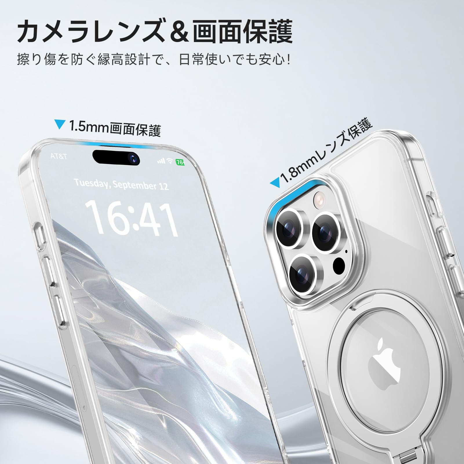 * 【最新!耐久性UP!360度回転スタンド】このiphone14pro 用 ケースには、最新の360度回転スタンドが搭載されており、縦横の角度を0°〜170°で自由に調整できます。市販のスタンドが横置きに対応できないという欠点を完全に解消しました!動画視聴やビデオ通話時に、最適な角度を簡単に設定でき、横置きの不便さを解消します。さらに、強力なベアリングを採用し、リング部分の耐久性が大幅に向上しました。最大10倍の耐久性を実現し、長期間使用することができます。片手で操作でき、便利さと耐久性を兼ね備えた優れたアイテムです。