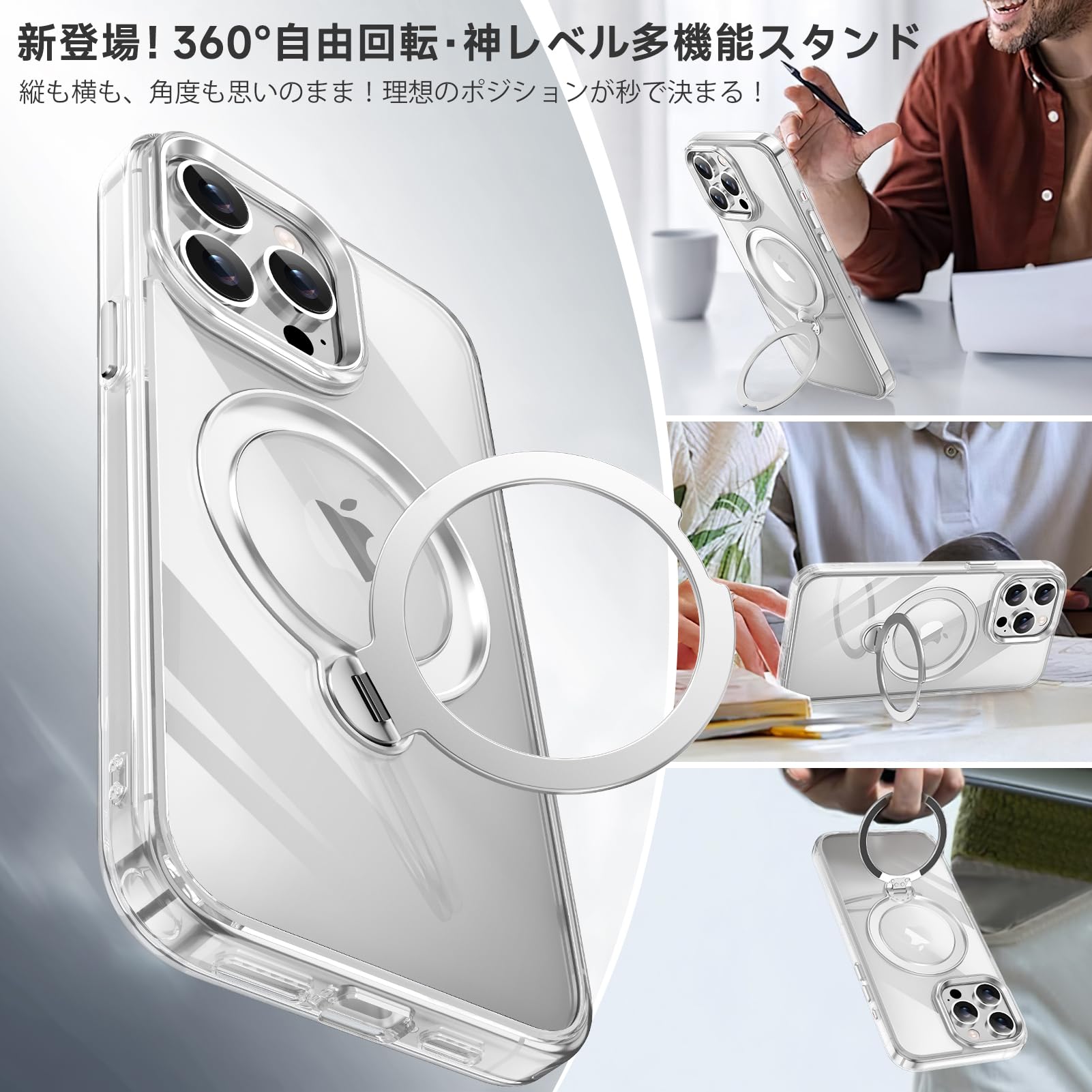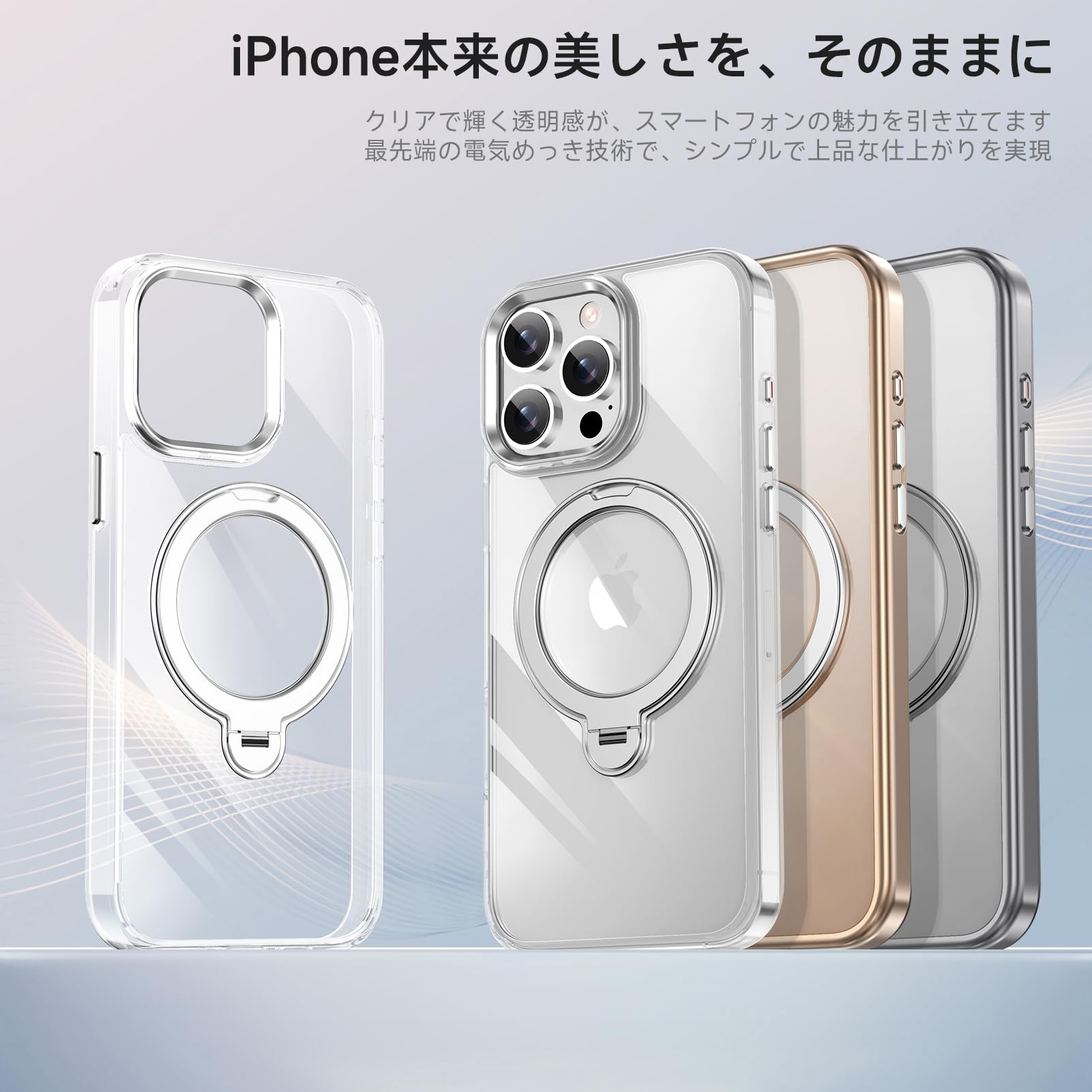 【透き通る上質感・多機能360°回転スタンド】KMAMBNG iPhone 15 Pro 用 ケース Magsafe対応【耐衝撃・金属感・真空メッキ・黄変防止・ストラップホール付き】縦横両立 角度自在 調整可能 磁吸機能でワイヤレス充電対応 おしゃれ スマホケース (クリア, iPhone 15 Pro)