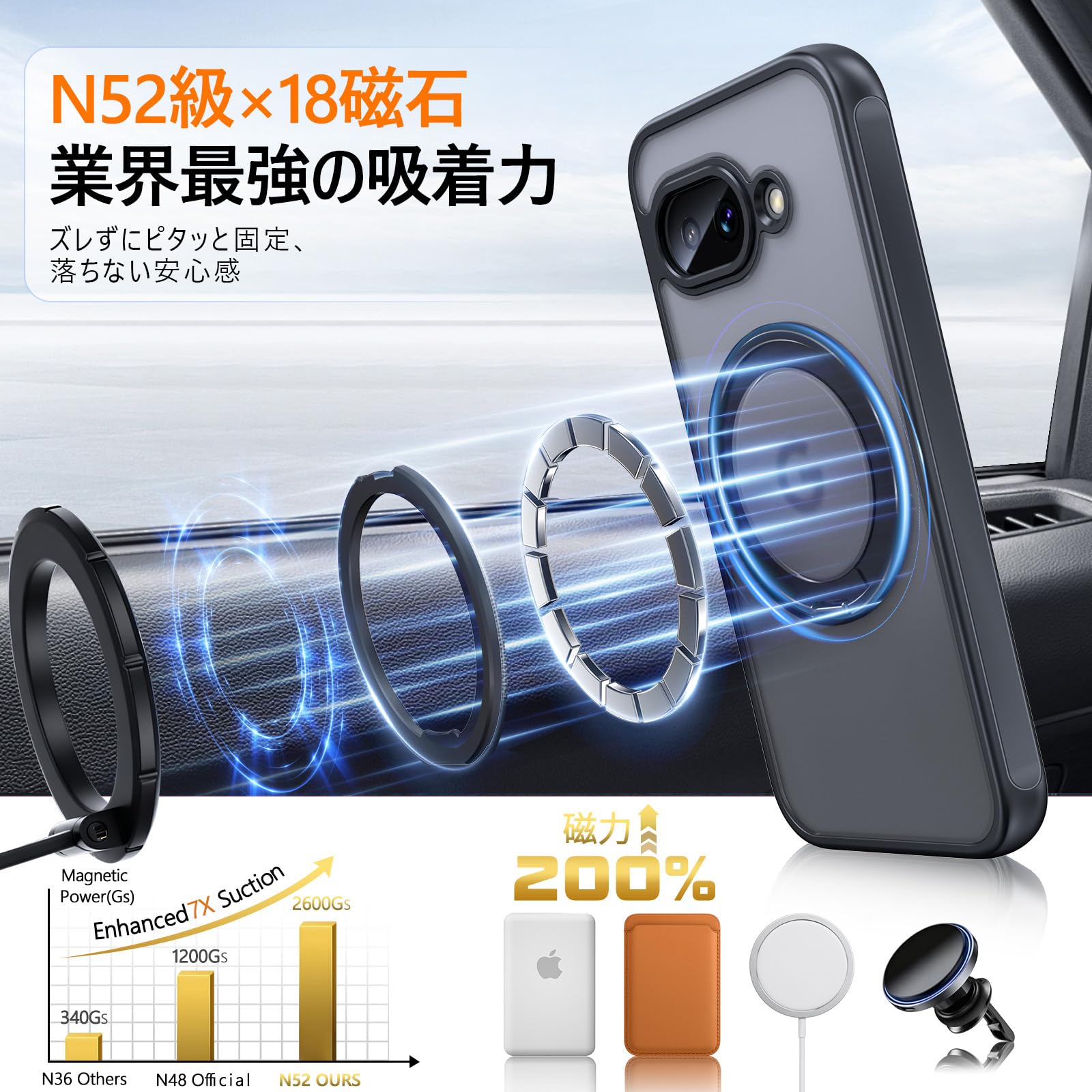 Google Pixel 9a 用 ケース Magsafe対応 360°回転スタンド グーグル ピクセル9a 携帯ケース リング マグネット搭載 ワイヤレス充電 縦横多角度 対応 カバー Uovon ぐーぐるぴくせる9a スマホケース 車載ホルダー ストラップ穴付き マット 半透明 指紋防止 黄変防止 米軍MIL規格 ・ ブラック