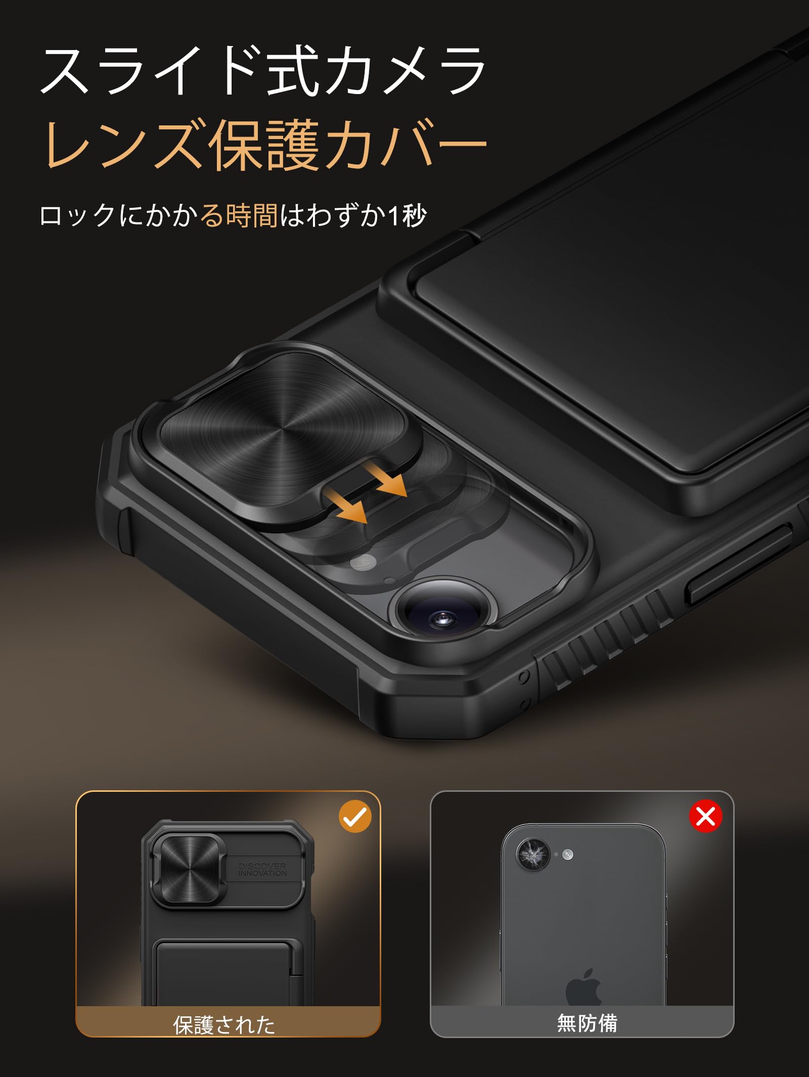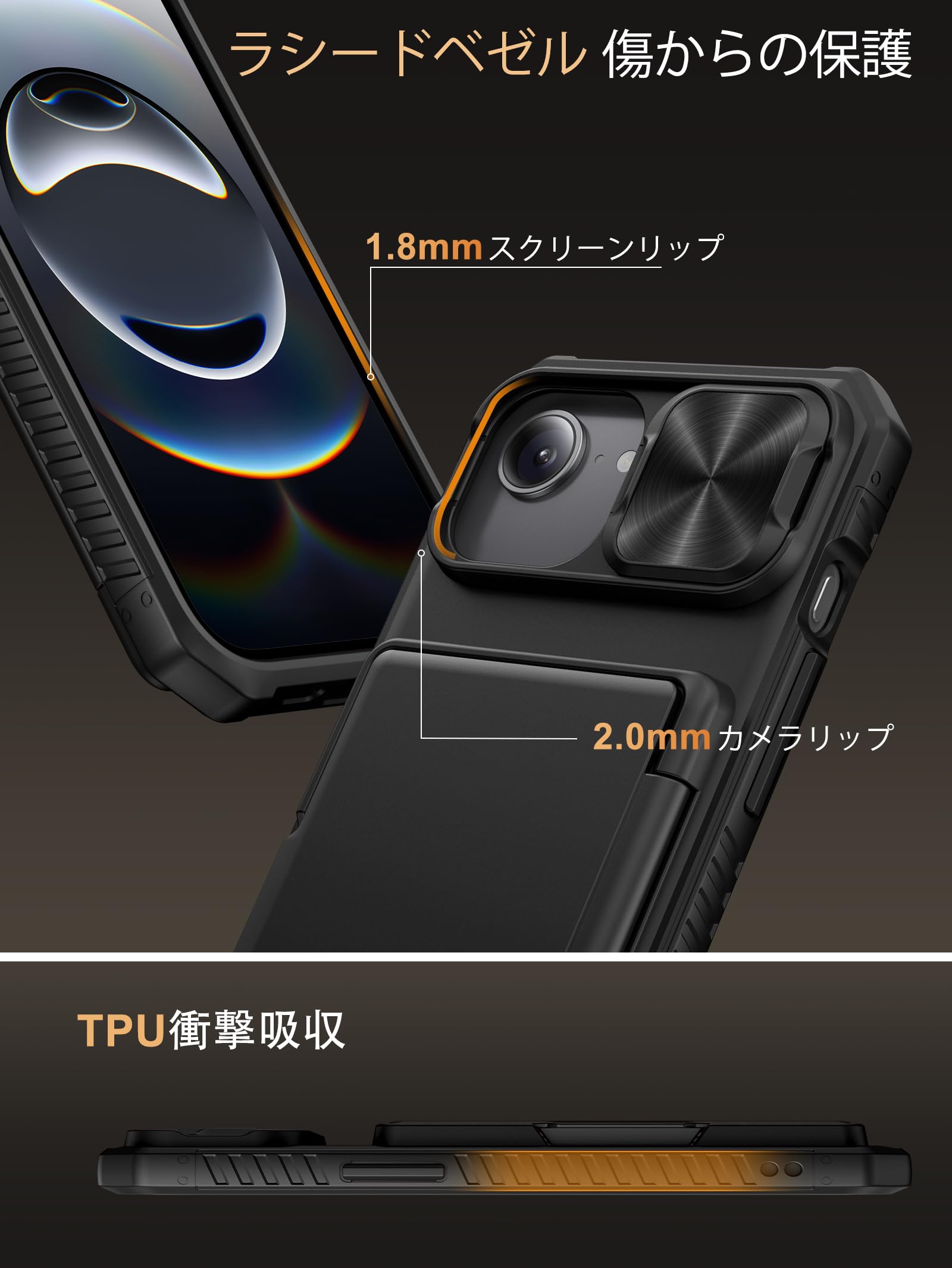 Vihibii iPhone 16e 用ケース カード収納 (4枚) 背面[RFIDブロッキング] カメラレンズ保護 iphone16e 米軍MIL規格取得 カバー 耐衝撃 滑り止め 財布付き アイフォン16e スマホケース(ブラック)
