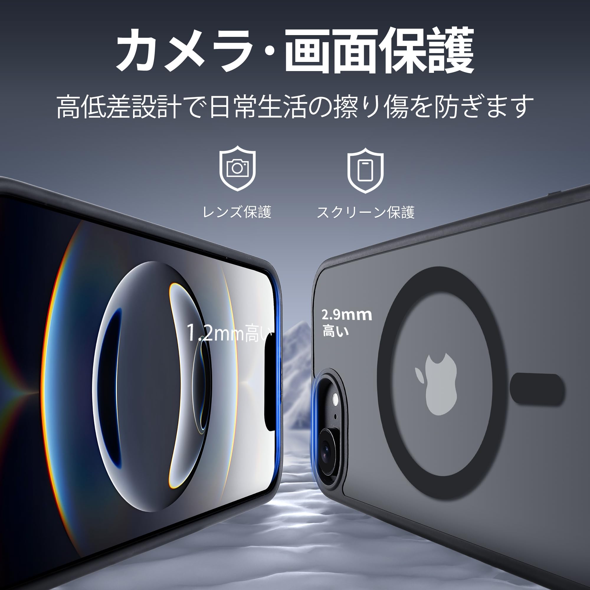 * iphone 16e ケースの曲線に従って高低差を設計。液晶画面より1.2mm高く、カメラレンズより2.9mm高く、机などの平面に置いても傷付く心配はない。※本製品は6.1インチしか対応できないですから、ご購入する前サイズを確認ください。