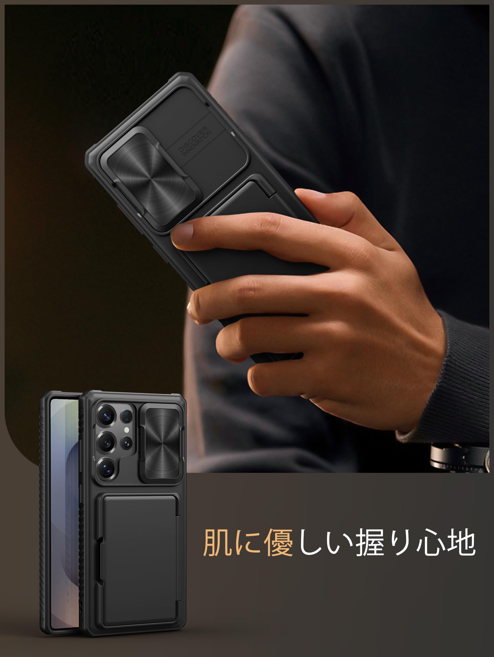 * 【財布-カード入れ-収納】背面デザインに収納スペースが設計されているsamsung s25 ultraケース。カードの厚さに応じて、少量の現金や4-5枚のカードを安全に収納することができますので、外出時にクレジットカード、身分証明書、運転免許、名刺、または少しの現金を持って外出をする場合は、とても便利です、かさばる財布を持ち運ぶ必要はありません。新たにアップグレードされた構造により、カードホルダーヒンジの位置はスマホケースの中心に固定され、カードや現金をより安全に保護します