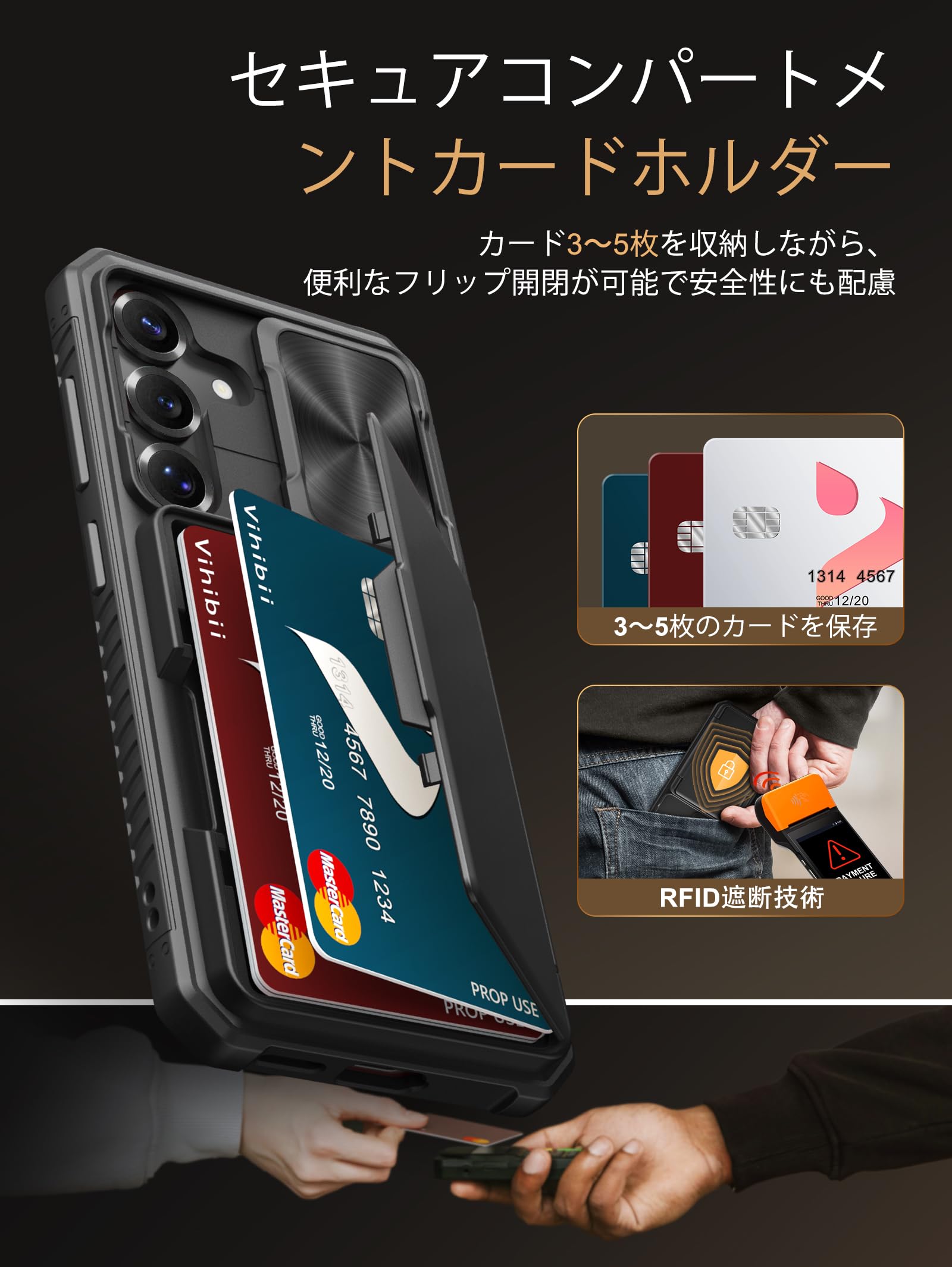 Vihibii Galaxy S25 ケース 背面 カード収納 (4枚) [RFIDブロッキング] カメラレンズ保護 米軍MIL規格取得 カバー 耐衝撃 滑り止め 手帳型 ギャラクシー S25 スマホケース (ブラック)