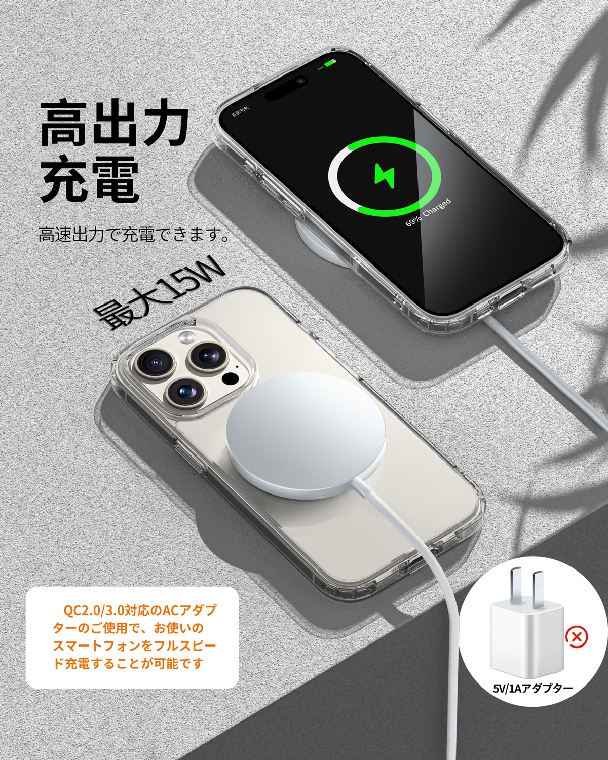 * 【強力マグネット式】磁気ケースでさらに安定。内蔵の強力な磁石がデバイスをピタリと固定し、充電中のズレを防止。磁気対応ケースを使用すれば、より強力な吸着力を発揮します。縦向き/横向きどちらでも安定保持するため、動画視聴やビデオ通話中の「ながら充電」に最適。磁力調整技術により、デバイスの内部回路に影響を与えない安全性も確保。「置くだけ」で正確に位置合わせが完了する、革命的なユーザビリティを実現しました。