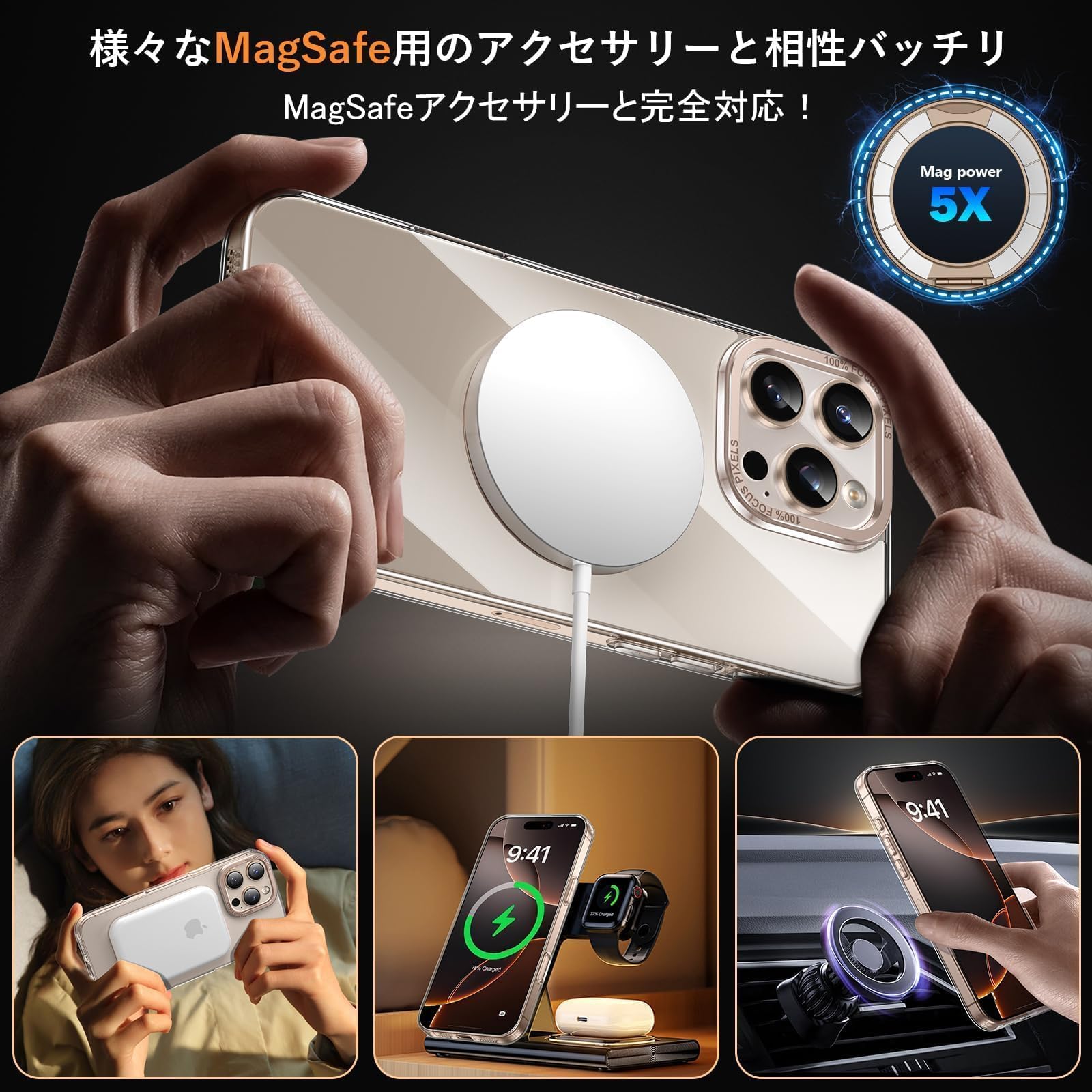 * 【MagSafe対応・磁力アップグレード】:強力なN52磁石を搭載しており、磁石吸着力は従来より10倍高め、ケースを装着したまま高速ワイヤレス充電が可能です、充電時の熱を周囲に発散して。Magsafe充電がかつてないほど簡単にできます!強い磁力により車運転中の激しい振動でもMagsafe車載ホルダーから外れることなく、市販のあらゆるMagsafeアクセサリーに簡単対応!いくら振っても落ちないので、充電しながらゲームをやっても問題なし!【 iphone 16 Pro 用 ケース アイフォン16Pro 用 ケース アイホン16プロ 用ケース】