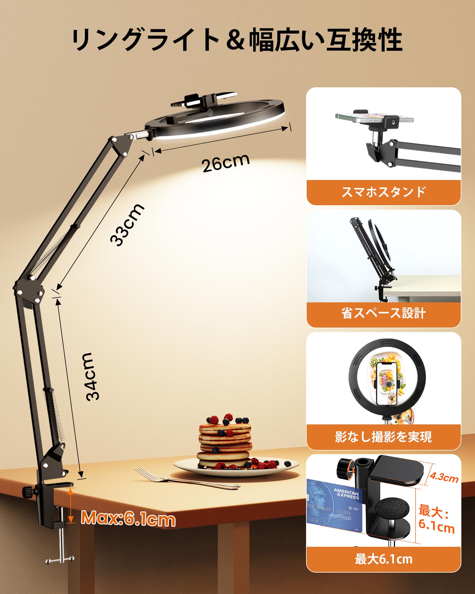 * 360°自由に調整可能なスマホスタンド付き: 金属アーム付きのスマホスタンドで、93CMまで高さ調節可能、360°全方向に角度を調整できます。俯瞰撮影や手元撮影、料理動画、メイク動画、Zoom会議、TikTokライブ配信など、多彩なシーンで使えます。プロフェッショナルなライティングが簡単に設定でき、デスクやパソコンに最適。