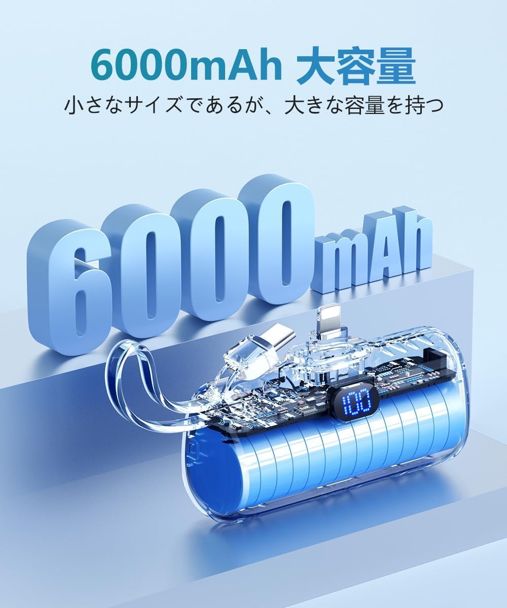 モバイルバッテリー 大容量 【ケーブル内蔵・軽量・約120g】 モバイル バッテリー 軽量 小型 6000mAh 2台同時充電 急速充電 モバイル充電器 ライトニングコネクター&タイプCケーブル内蔵 iPhone/Android全種機器対応 直差し タイプc LED残量表示 安全設計&回路保護 PSE技術基準適合 機内持ち込み可 コンパクト アウトドア/出張/旅行/停電対策/緊急防災に