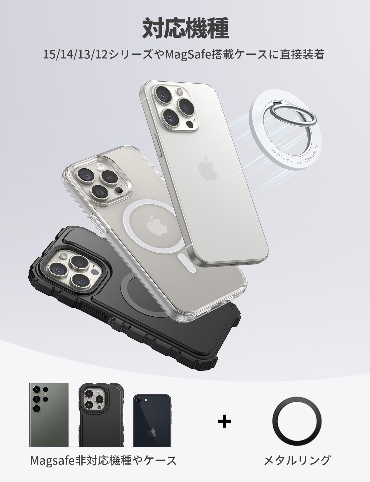 * 【対応機種】iPhone 2025, iPhone 17, iPhone 17 Pro, iPhone 17 Pro max, iPhone Air, iPhone 16, iPhone 16Plus, iPhone 16Pro, iPhone 16Pro Max, iPhone 15, iPhone 15Plus, iPhone 15Pro, iPhone 15Pro Max, iPhone 14, iPhone 14pro, iPhone 14pro max, iPhone 14Plus, iPhone 13, iPhone 13 Pro, iPhone 13 Pro Max, iPhone 13, iPhone 13 mini, iPhone 12, 12 Pro, 12 Pro Max, 12 miniの本体やMagSafe搭載ケースに直接装着可能です。付属されたメタルリングを利用すると、磁力がもっと強くなります。