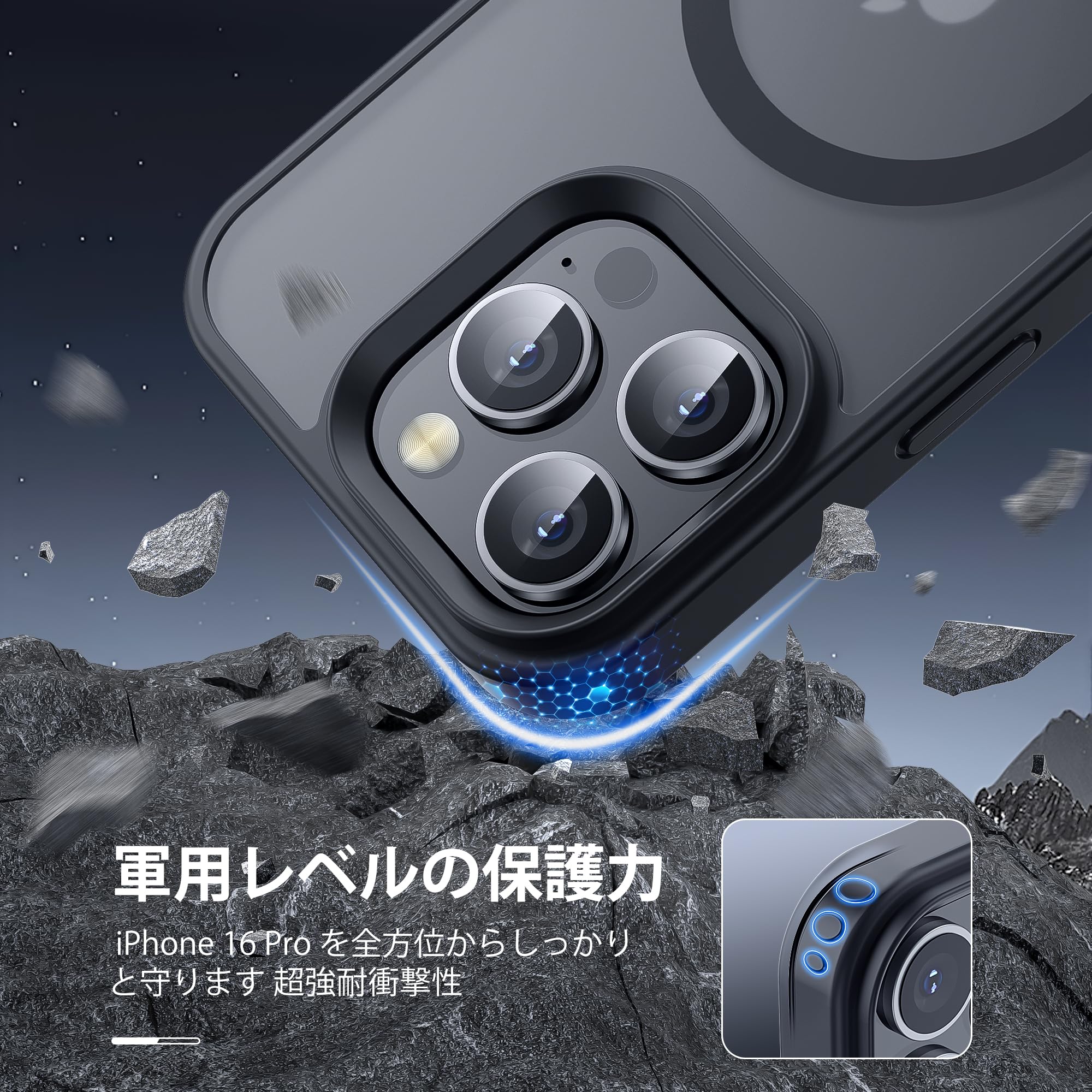 * いくら気をつけていても落とす時がある!でも大丈夫!2Mの高さから26回以上落としても本体は綺麗に無傷!背面「カメラエアバッグ」耐衝撃技術も備えています。耐震性の高いTPUバンパーと頑丈なPC背面と組み合わせた二重構造で、非常に高い耐衝撃性を誇り、アイフォン16 Pro を全方位からしっかりと守ります。