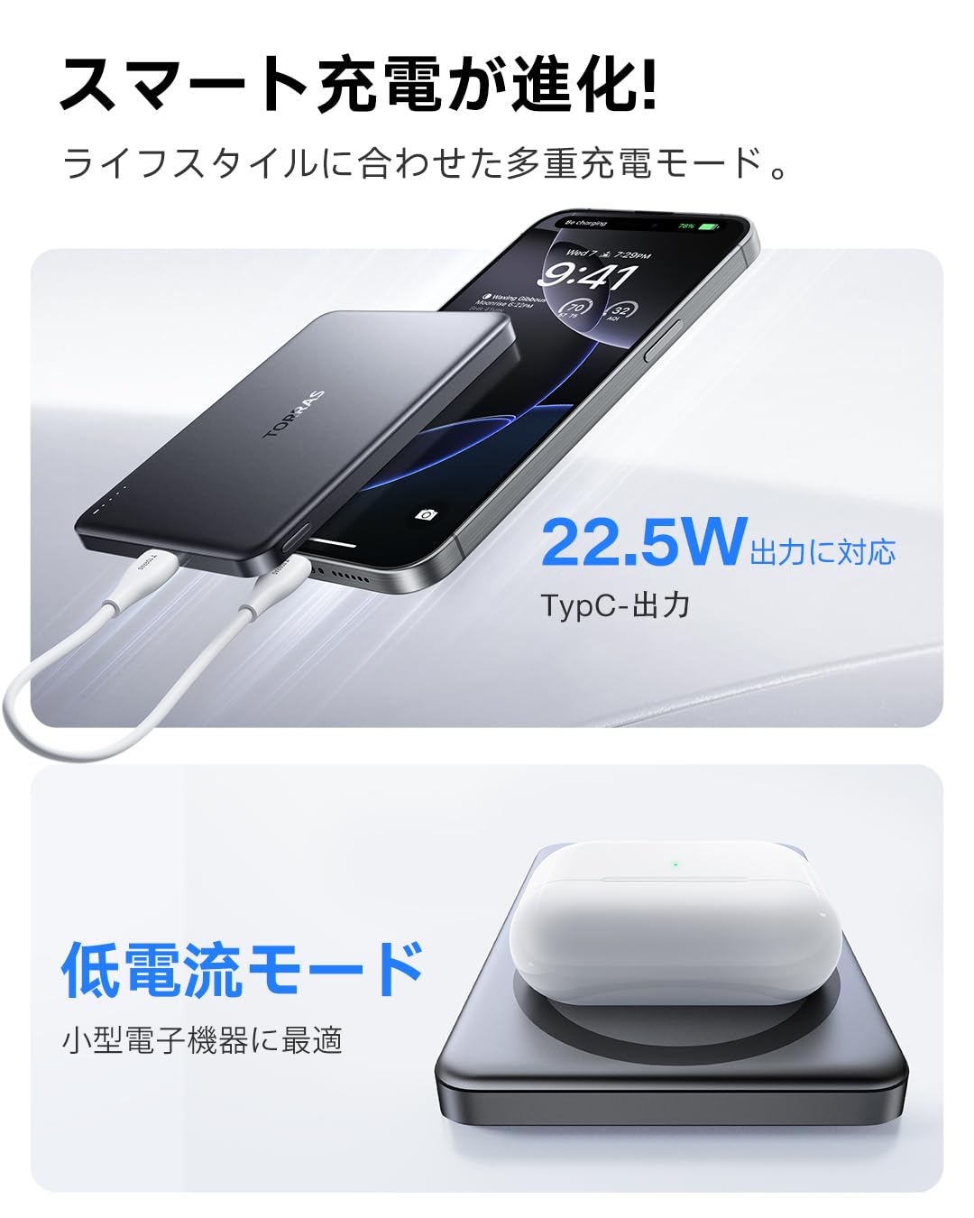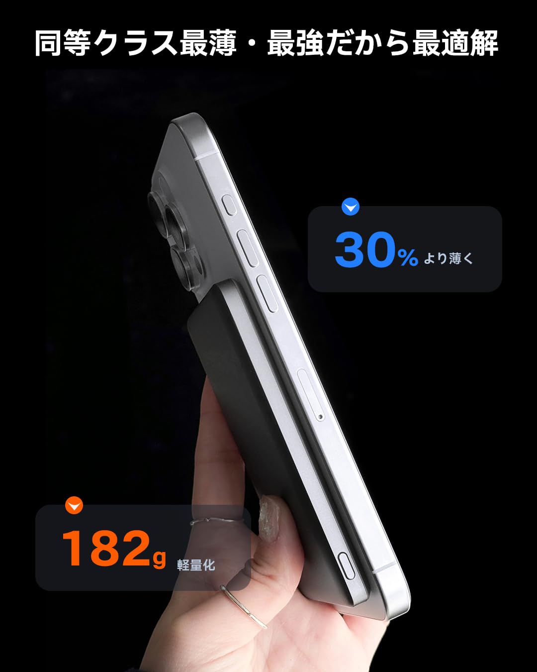 * 同等クラス最薄・最強だから最適解:モバイルバッテリー探しで迷ったらTORRASが選択。10000mAhのmagsafe対応モバイルバッテリーの中で極限まで薄く設計された。約14mmだけを実現。掌サイズなのでスマホにくっつけた状態で握ればそれほど負担に感じません。携帯性のバランスが取れた容量が、iPhone 17に約2回以上充電できます。1泊2日程度の旅行や出張や日帰り登山の際に活躍します。