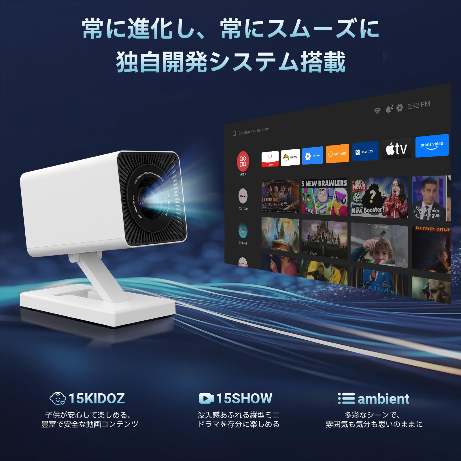 * 【8.19追加】家庭用ぷろじえくたーのシステムを最新バージョンに更新すると、子供が安心して楽しめる「15KIDOZ」動画アプリや、縦画面で没入感ある視聴ができる「15SHOW」英語ミニドラマアプリが追加され、豊富な映像コンテンツを無料で楽しめます。さらに「ambient(環境投影)」機能では、スマートフォンから写真や動画を送信し、壁を光とアートに満ちたダイナミックなキャンバスや季節・イベントに合わせた背景として演出可能。独自のシステムと継続的なコンテンツ更新により、常に進化した家庭シアター体験をお届けします。直感的でわかりやすいモバイルアプリ操作で、誰でも快適にコントロールできます。