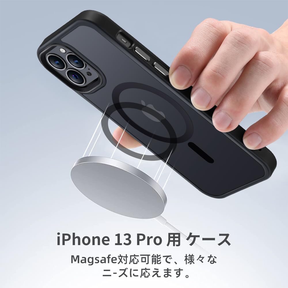 【米軍規格・MagSafe対応】Gtsoho iPhone 13 Pro 用 ケース 半透明 米軍規格 耐衝撃 マグネット搭載 マット感 黄ばみなし ストラップホール付き マグセーフ対応 ワイアレス充電対応 マットブラック