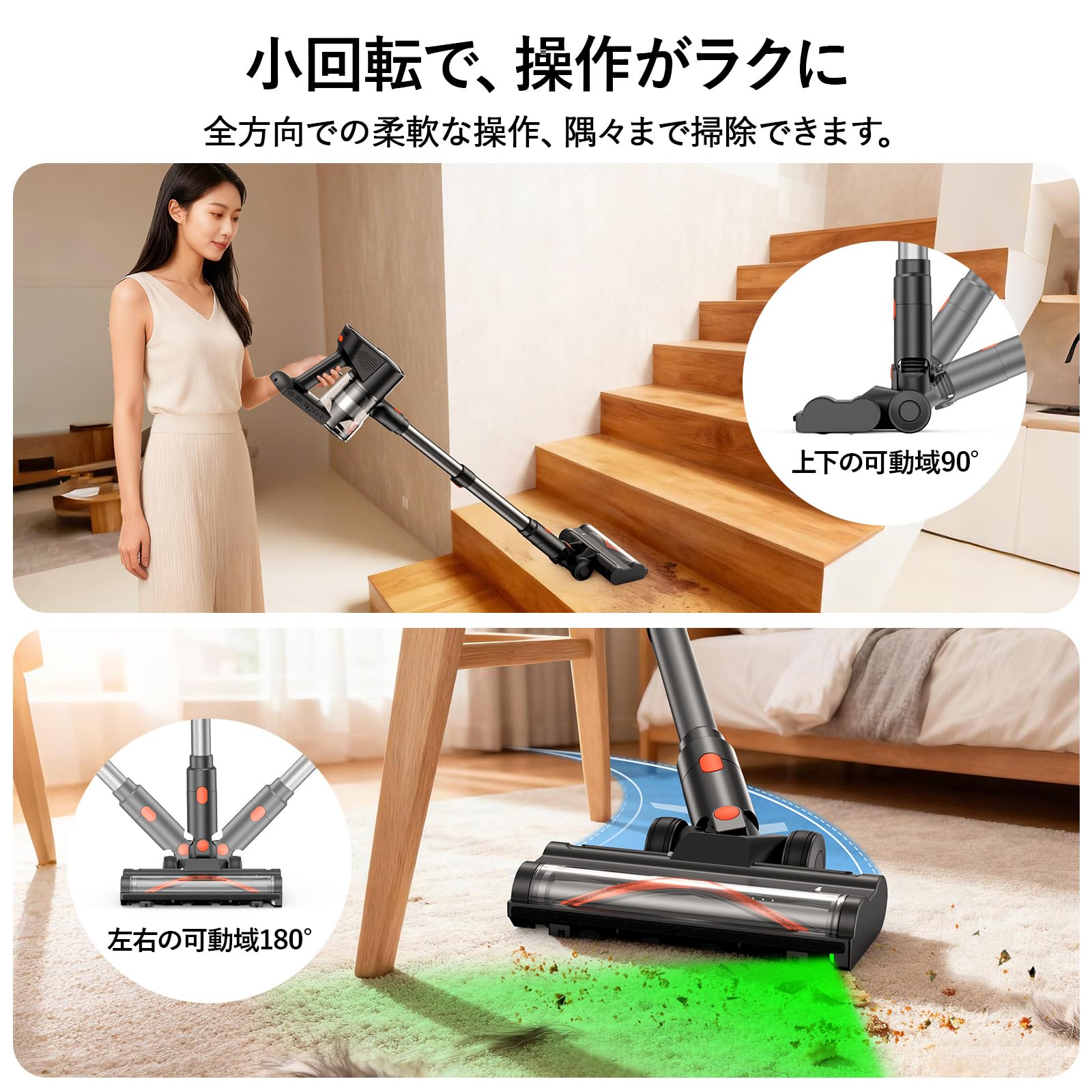 * 【暗がりも見逃さないLEDグリーンライト-隅々まで“見える化”】 本機はブラシヘッドに搭載したグリーンLEDライトで、家具の下やベッド下、ソファの隙間など視認しづらい場所のゴミまで明るく照らします。見落としやすい髪の毛や小さなホコリも可視化できるため、掃除効率が格段に向上。ライト点灯で「掃除漏れゼロ」を目指せる実用的な機能です。