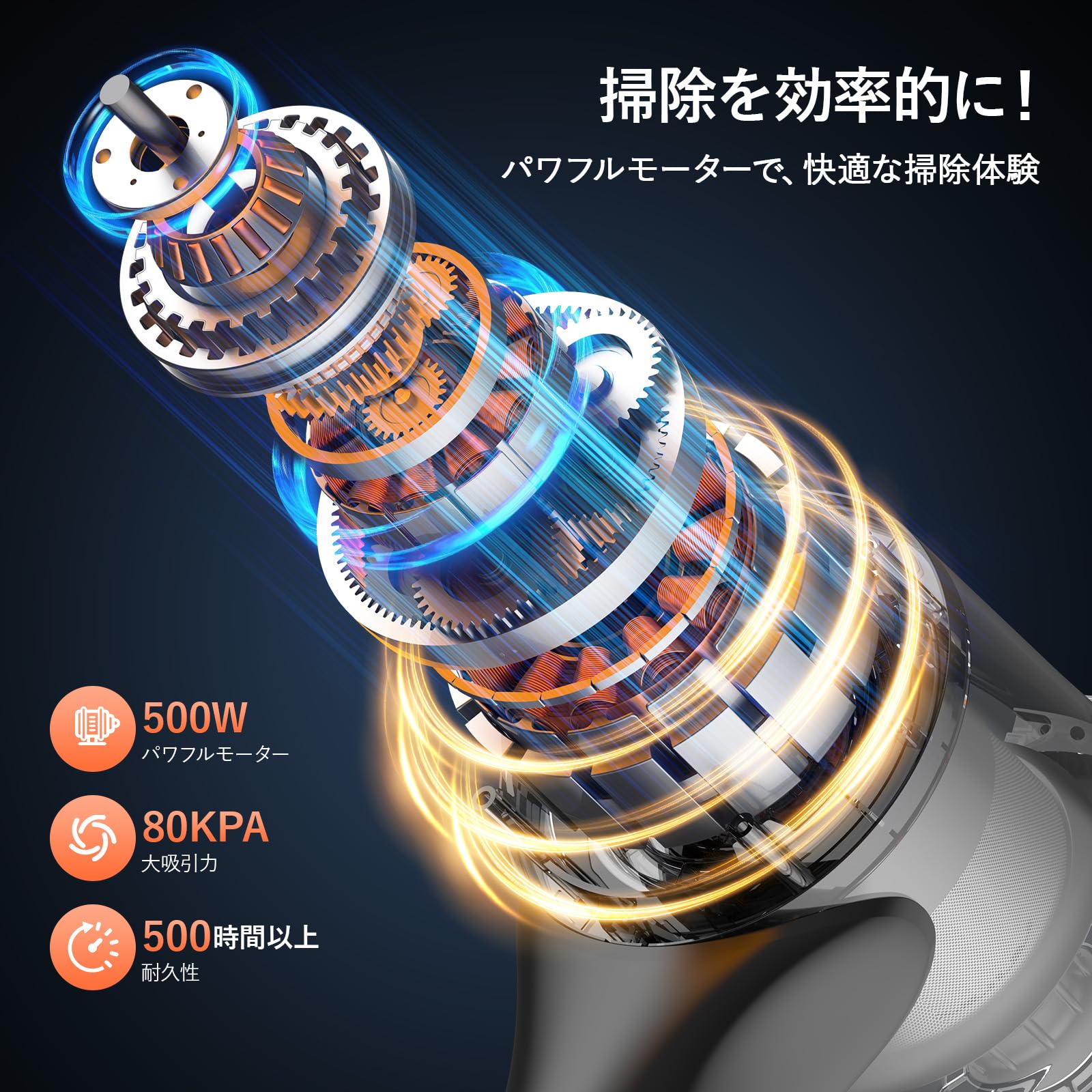 * 【驚異の80KPa強力吸引-微細ゴミもペット毛も一気に】 LUNINOコードレス掃除機は、500W高性能ブラシレスモーターを搭載。省エネ・長寿命・軽量を実現しました。最大吸引力は業界トップクラスの80KPaで、従来モデルより約68%アップ!遠心分離サイクロン構造により吸引持続率99%をキープし、床の微細なホコリからペットの毛、隙間のゴミまで一気に吸い取ります。さらに、新開発のV字型ローラーブラシを採用。毛髪やペットの抜け毛が絡まりにくく、カーペットやフローリングの奥に入り込んだゴミも逃さずキャッチ。ブラシの形状が中央にゴミを集めるため、吸引効率が向上し、少ないストロークでもキレイに!【限定期間キャンペーン】今ご注文いただくと、交換用HEPAフィルターまたは電動ダ二ブラシヘッドがもらえる!