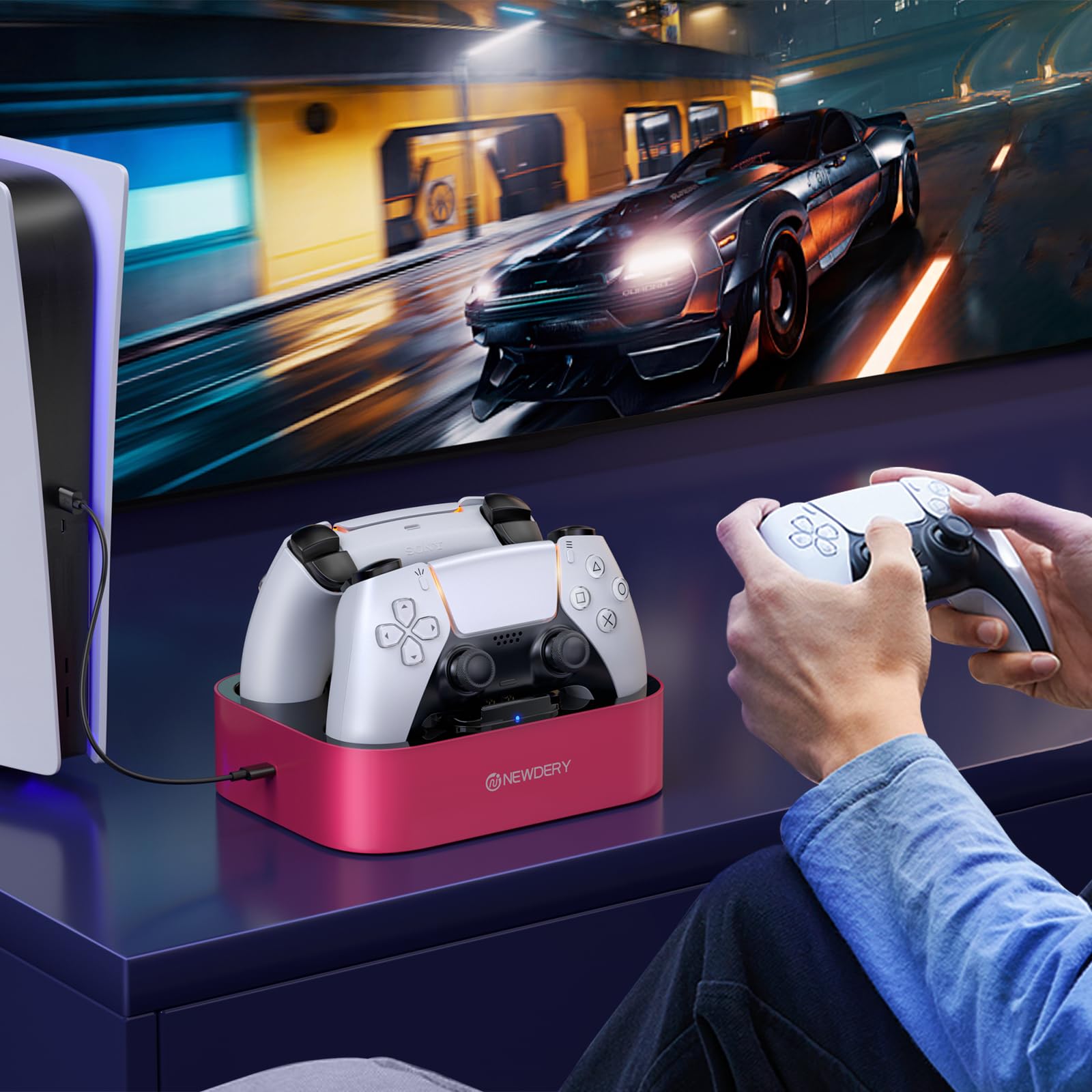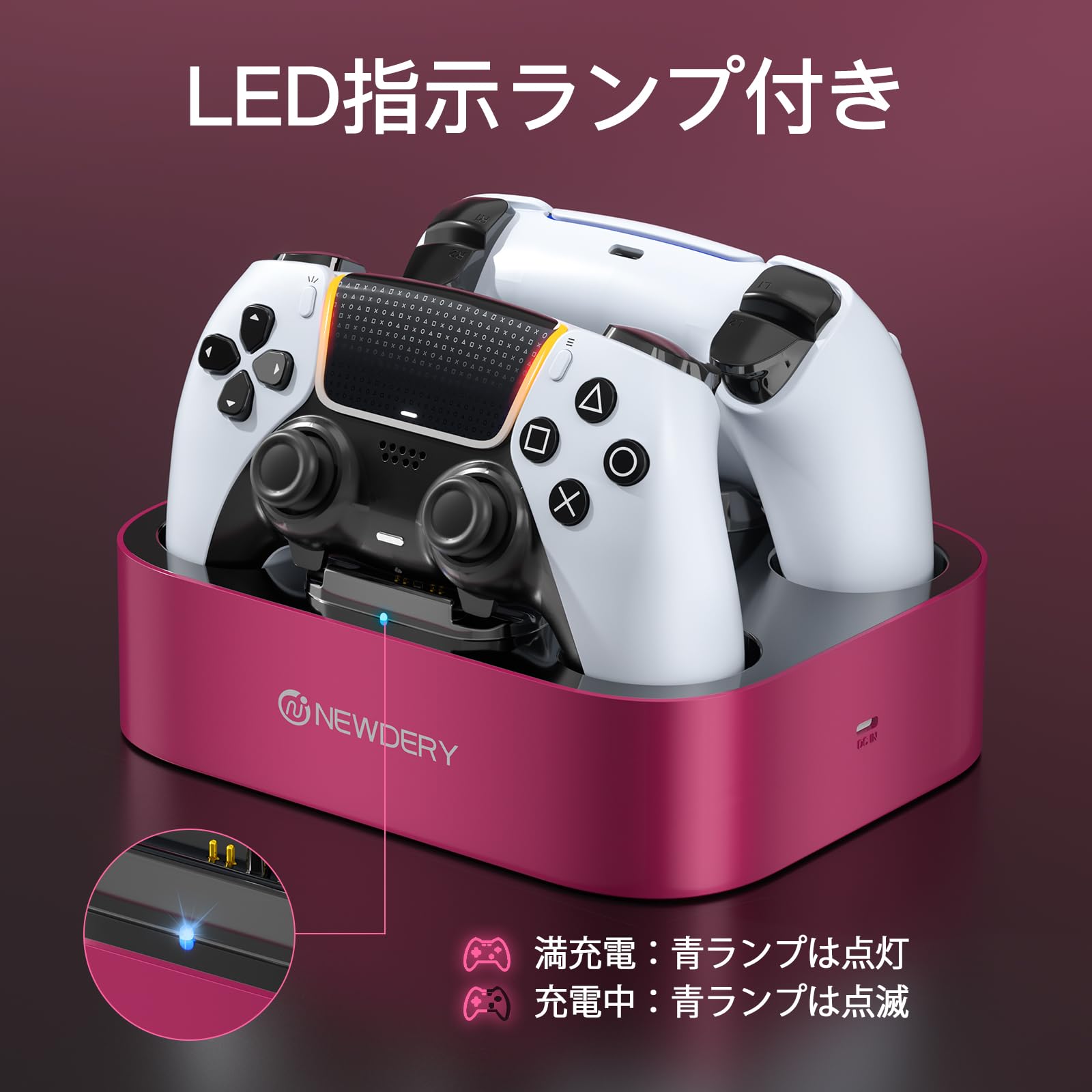 NEWDERY PS5 コントローラー 充電スタンド 2台同時充電可能 置くだけ収納可能 過充防止 USB-Cケーブル付属 LED指示ランプ付き レッド