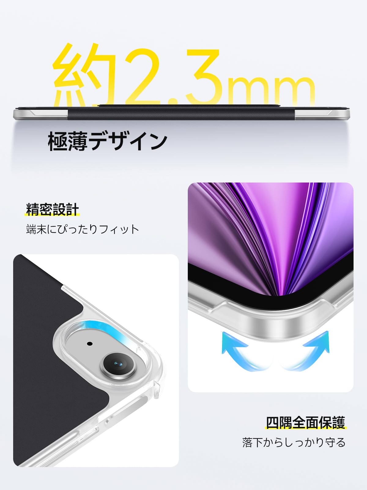 * 【磁気吸着&360°全面保護】 背面に強力マグネットを内蔵し、ケースが本体にしっかり密着。カバーの開閉で自動スリープ/ウェイクに対応。四隅強化に加え、360°全周を包み込むフルカバー設計で、落下衝撃、摩擦、埃や指紋からもしっかり守ります。
