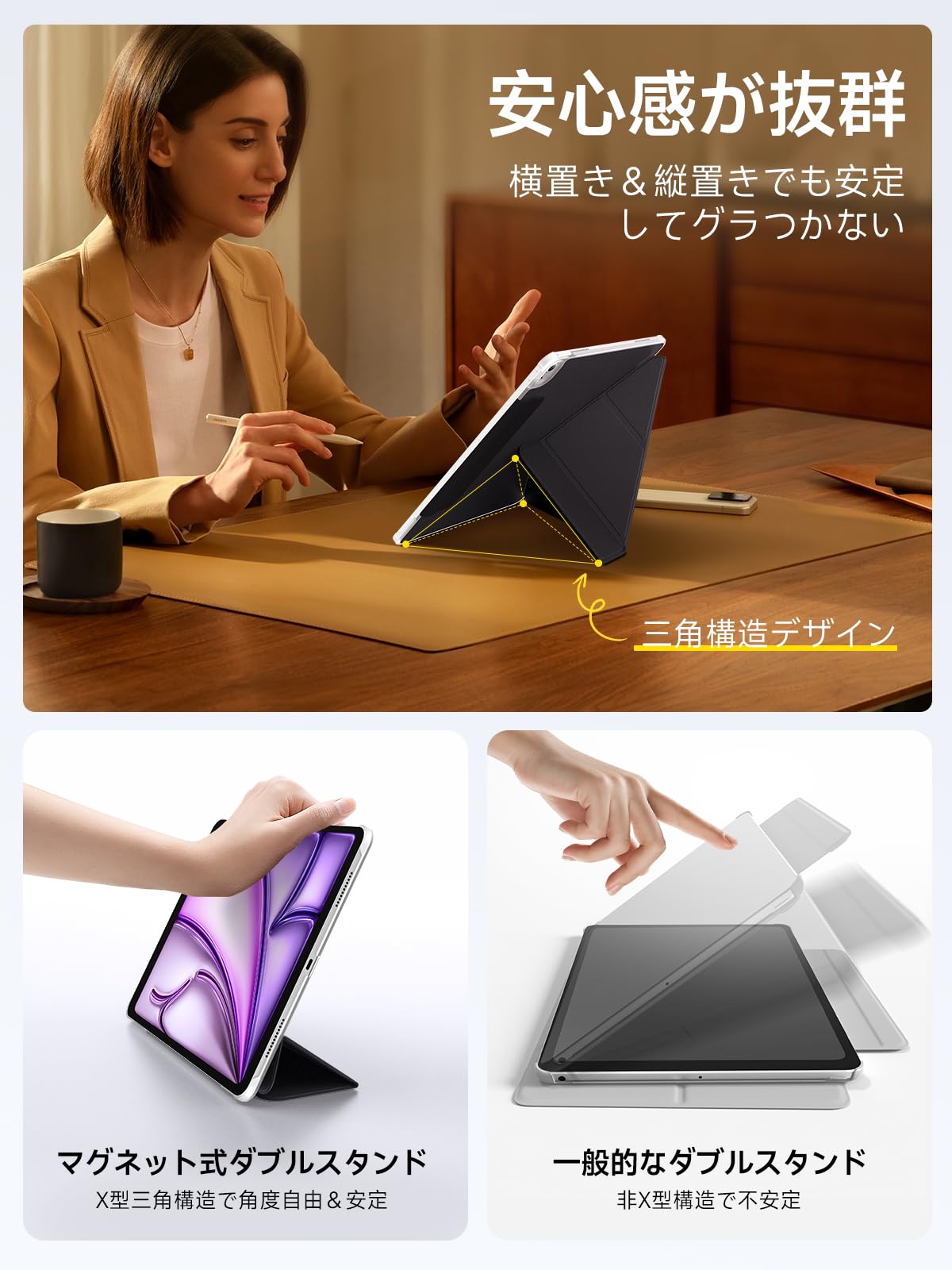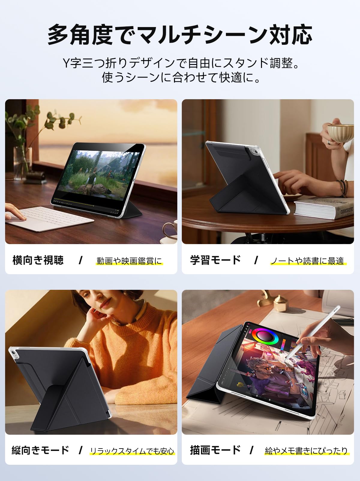 * 【Y字折り構造スタンド】 独自のY字折りデザインで、縦置き・横置きの両方に対応。動画視聴、オンライン授業、読書、タイピング、イラスト制作まで幅広く活躍。4段階角度調整で快適性を追求しました。