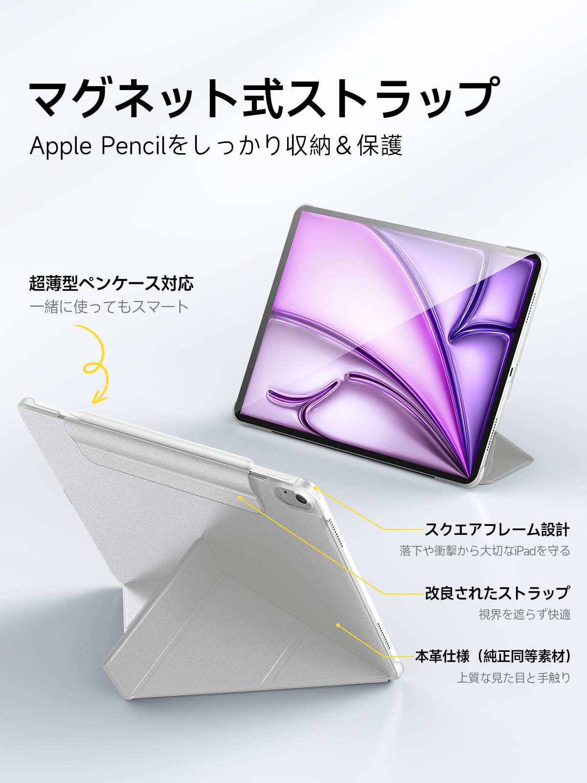 * 【高級PUレザー&隠しペン収納】 外側は防水・防汚仕様の高級PUレザー、内側は柔らかなマイクロファイバーで画面を優しく保護。背面にApple Pencil対応の隠しホルダーを搭載し、充電中も未使用時もスマートに収納可能。