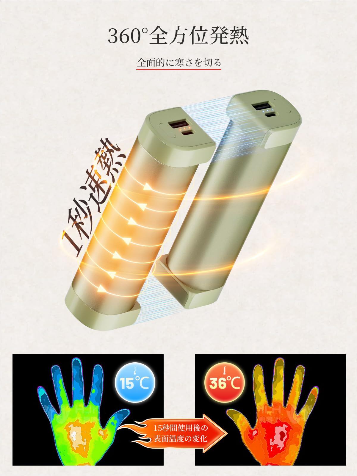 * 【1秒でポカポカ!360°全面発熱】充電するだけで、繰り返し使えるエコなカイロが新登場!寒さが厳しい日でも、スイッチを入れてたった1秒ですぐ温もりを実感。手先の冷えが気になる時も、サッと取り出して即効暖まろう。 360°全面発熱設計で、どこを持ってもまんべんなく温かく。握り方や置き場所を選ばず、じんわり持続的なあたたかさが続きます。 繰り返し充電可能なので、使い捨てカイロよりも経済的&地球に優しい。高い保温性能で、アウトドアや通勤・通学、オフィスでも大活躍!