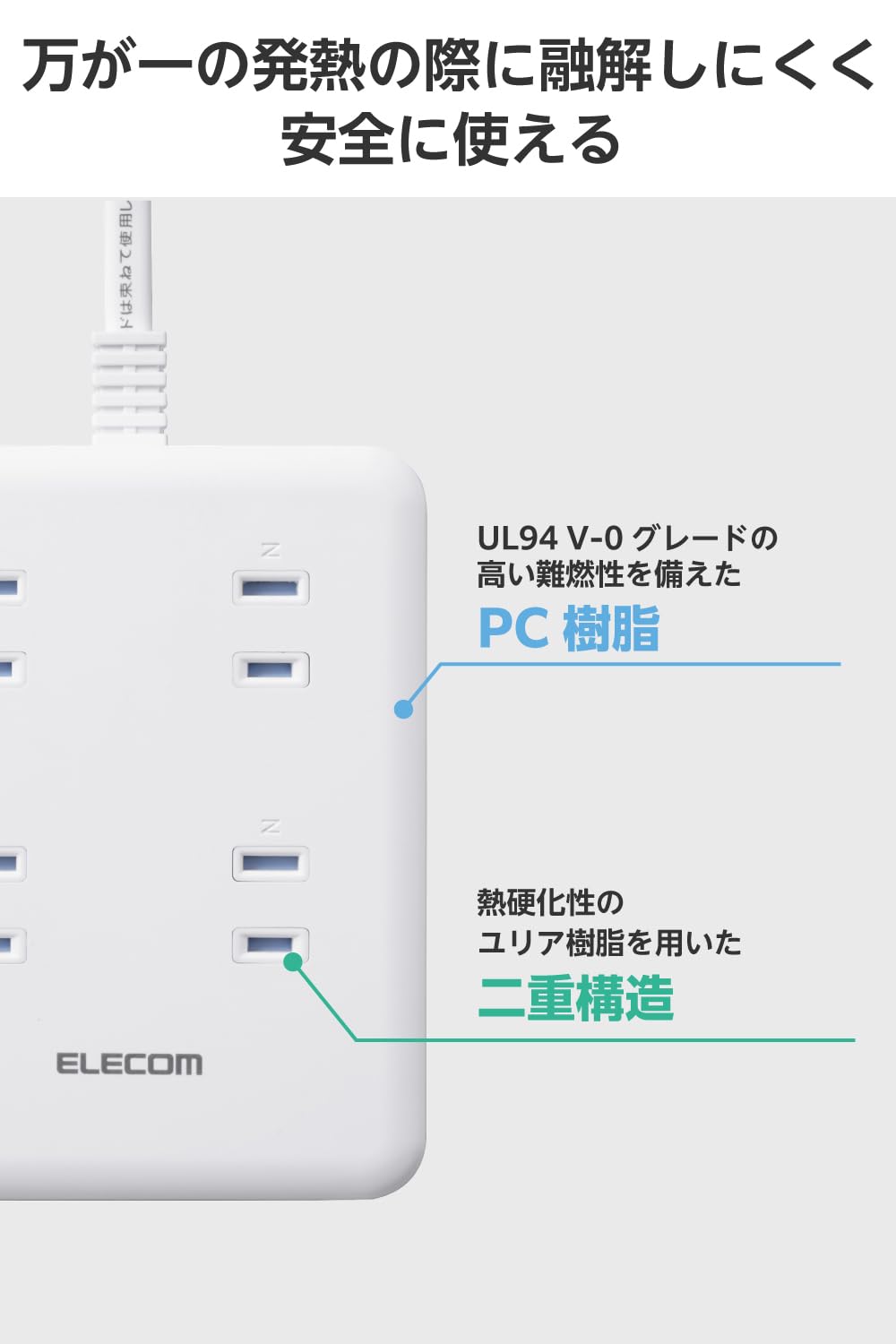 * 筐体にはUL94 V-0グレードの高い難燃性を備えたPC樹脂、AC差込口の周りには熱硬化性のユリア樹脂を用いた二重構造で、万が一の発熱の際に融解しにくく、電気火災の防止に有効です。