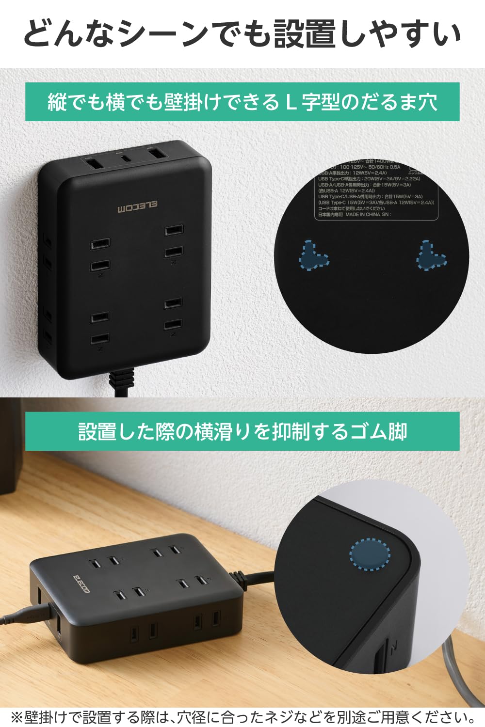 エレコム 電源タップ USB付き 20W PD対応 Type-C×1 USB-A×2 ACプラグ×8 2.5m 雷ガード ホコリ防止シャッター ブラック ECT-44-8A2C25BK