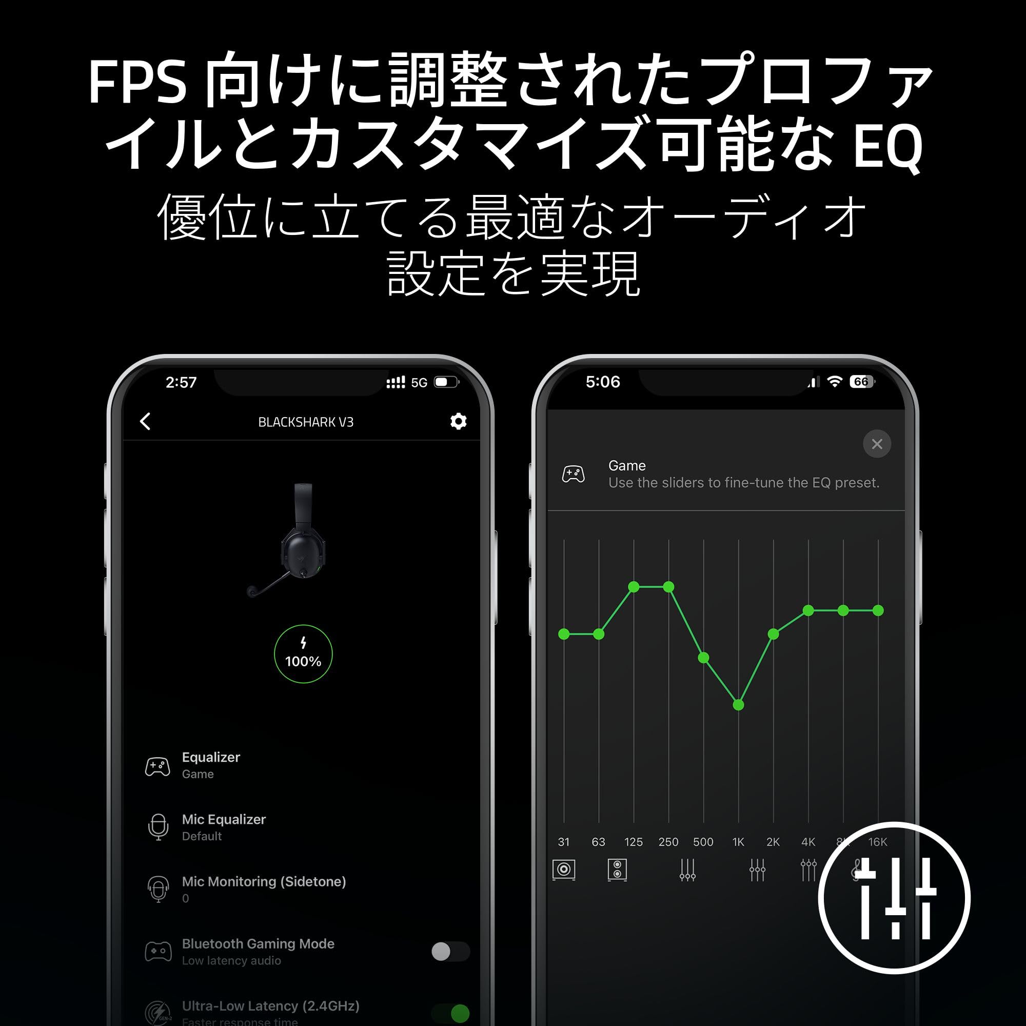 * 【FPS 向けに調整されたプロファイルとカスタマイズ可能な EQ - 優位に立てる最適なオーディオ設定を実現】 Razer の e スポーツチャンピオンと精密に調整されたゲーム専用 EQ プロファイルで、オーディオの優位性を高めよう。自分の EQ を作成し、ヘッドセットに保存すれば、いつでも対戦に対応できます。