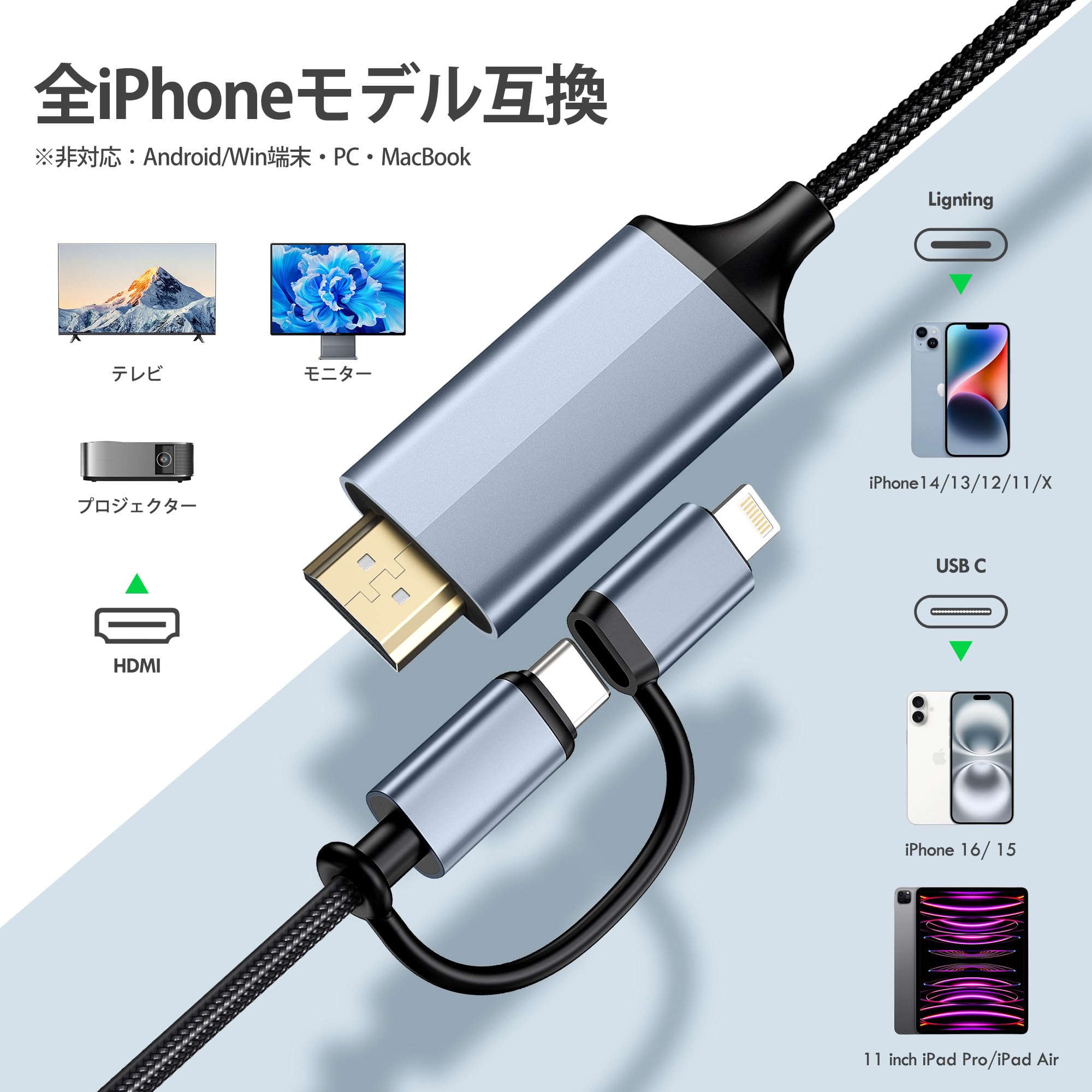 * [広範囲互換性のデュアルインターフェイス] Lightning iPhone(14/13/12/Pro/Max)とType-C端末(iPhone17/16/15、iPad Pro 2021以降、iPad Air)をHDMIディスプレイに一本接続!複数ケーブル不要で、Apple混在環境のご家庭/オフィスに最適。注️:ノートPC/Androidスマホ対象外