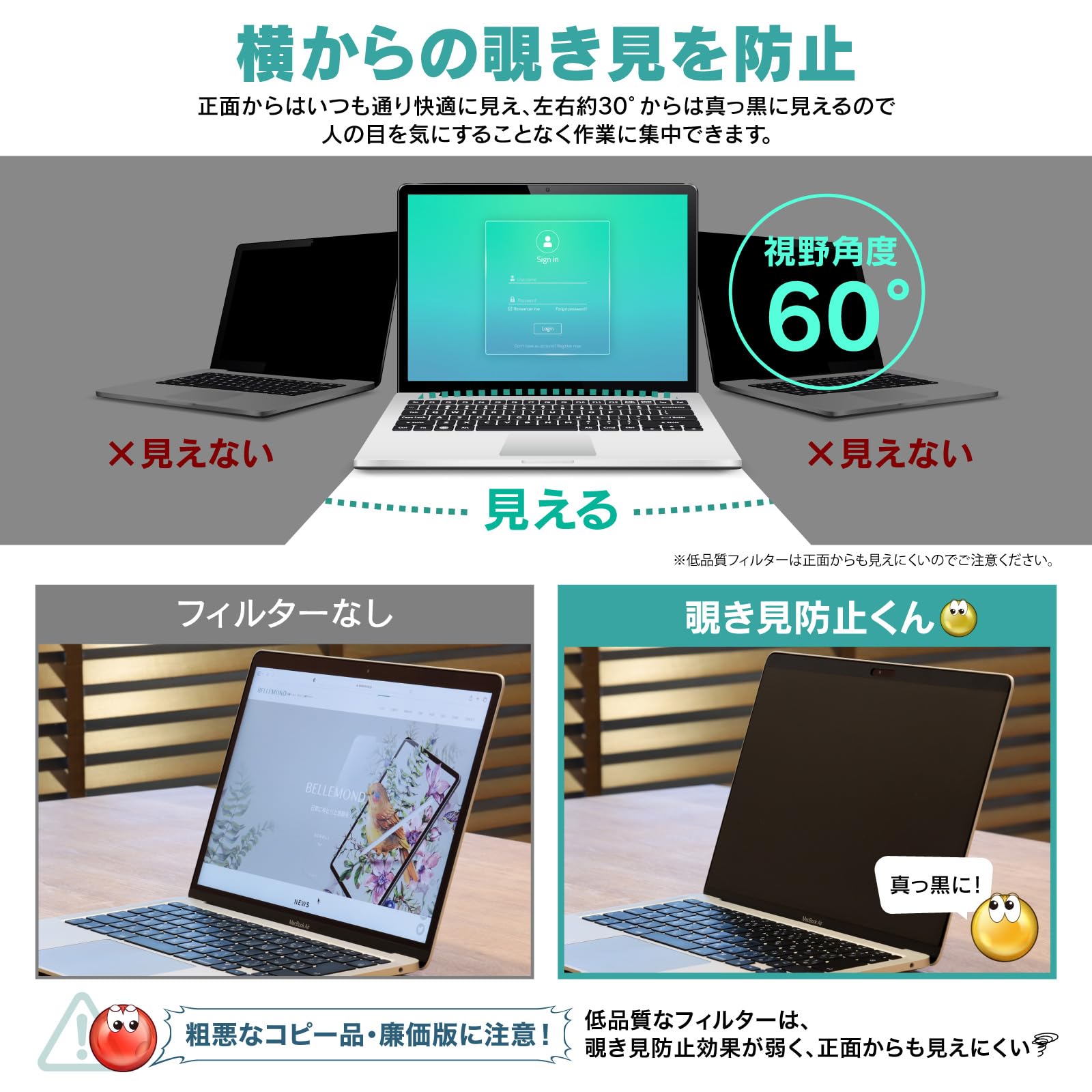 * ▶▶▶【視野角度60°】:正面からはいつも通り快適に見え、左右約30°からは真っ黒に見えるので人の目を気にすることなく作業に集中できます。新幹線・カフェ・コワーキングスペース・オフィスなどでの作業効率アップにお役立てください。※低品質フィルターは正面からも見えにくいのでご注意ください。▶▶▶【リバーシブル仕様】:グレア(光沢)・アンチグレア(非光沢)のリバーシブル仕様。鮮明な映像を楽しみたい場合はグレア(光沢)、反射防止効果を重視する時にはアンチグレア(非光沢)面をご使用ください。※正面から見た場合の違いです。どちらの面も左右約30°からは真っ黒になります。