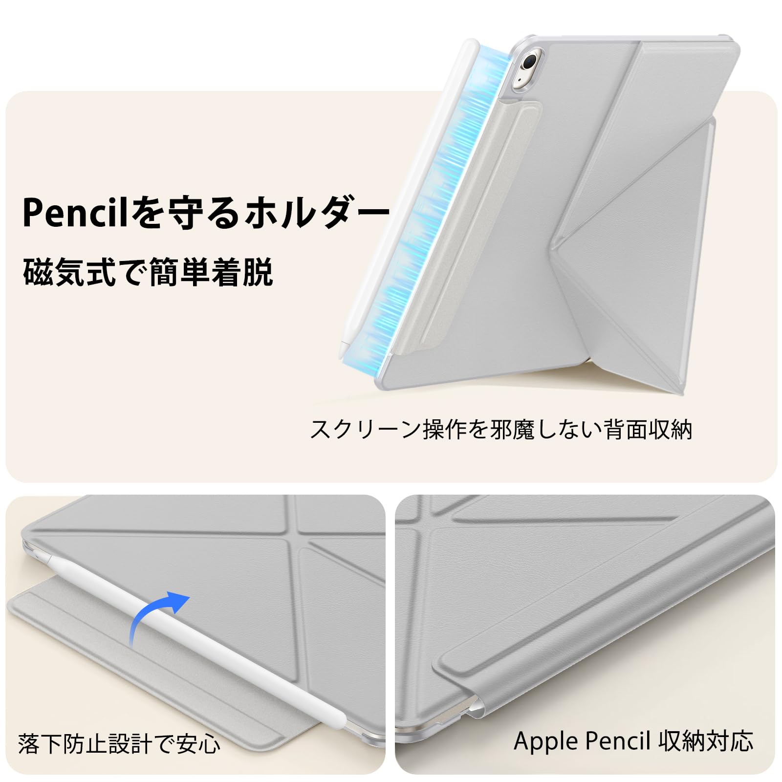 * 【高品質PUレザー&Apple Pencil収納対応】高級感のあるPUレザー素材を採用し、肌触りが良く、傷・水・汚れに強い仕上げ。内側は起毛加工で画面を優しく保護。さらに、Apple Pencil対応収納バンドを背面に搭載。充電中のPencilをしっかり固定し、未使用時は折りたたんでスッキリ収納できます。機能性と美しさを兼ね備えたiPad用レザーケースです。