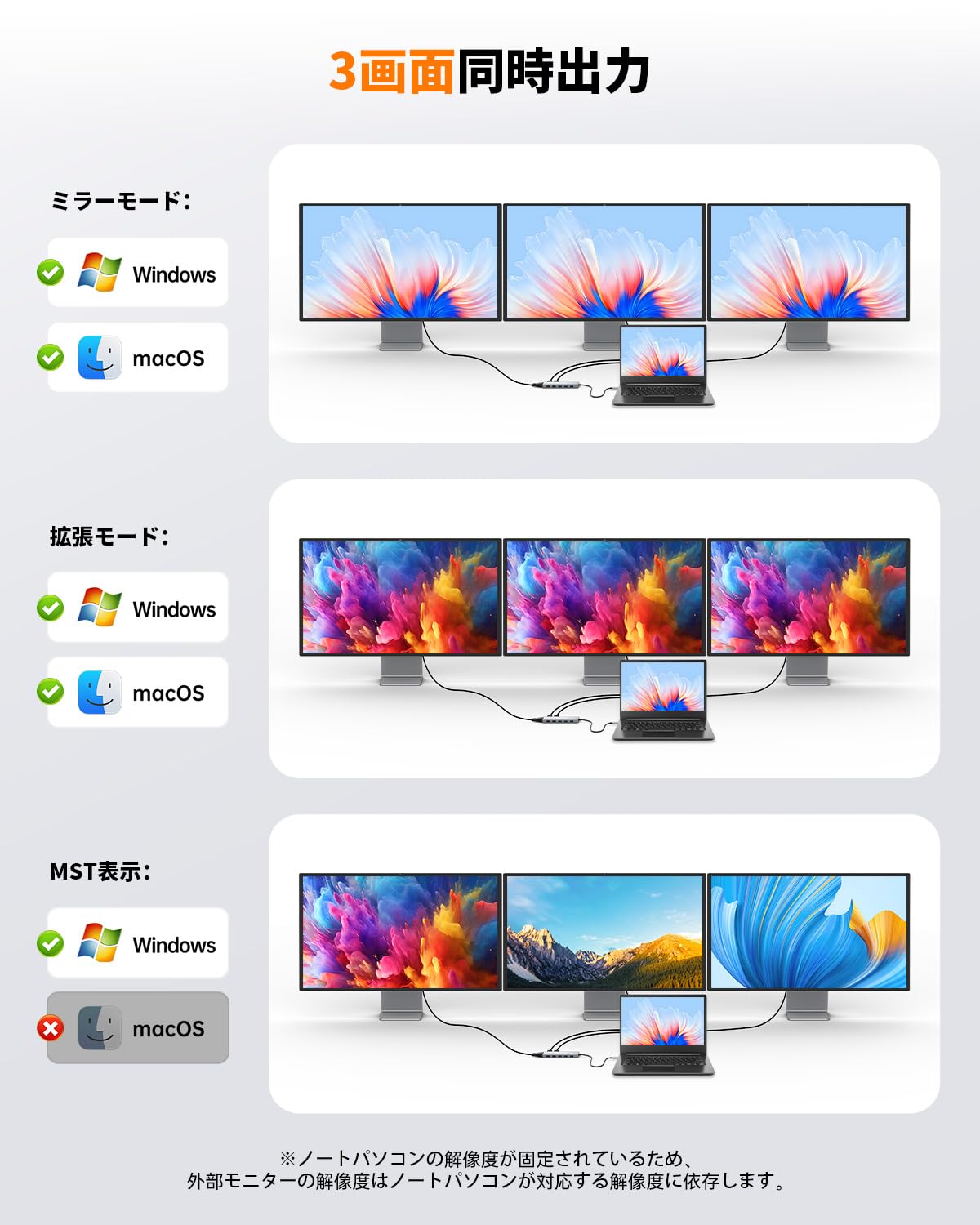 * トリプルディスプレイ対応(Windowsのみ拡張表示) Windowsでは最大3画面の拡張表示が可能。HDMI×2とVGAポートを使用して、2画面時は4K@30Hz+1080P、3画面時は全画面1080P@60Hzに対応(DP1.4対応のPC・モニターが必要)。Macはミラーモードのみ対応。HDMI1は単独使用時に最大4K@60Hzに対応します。