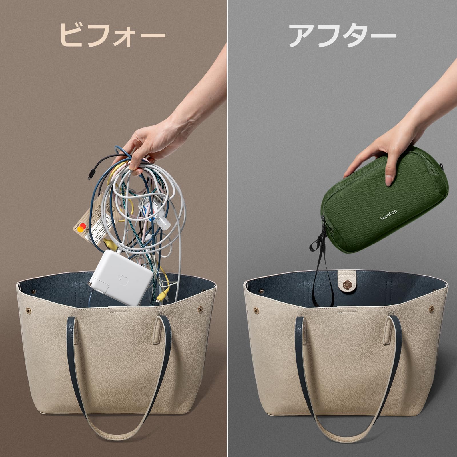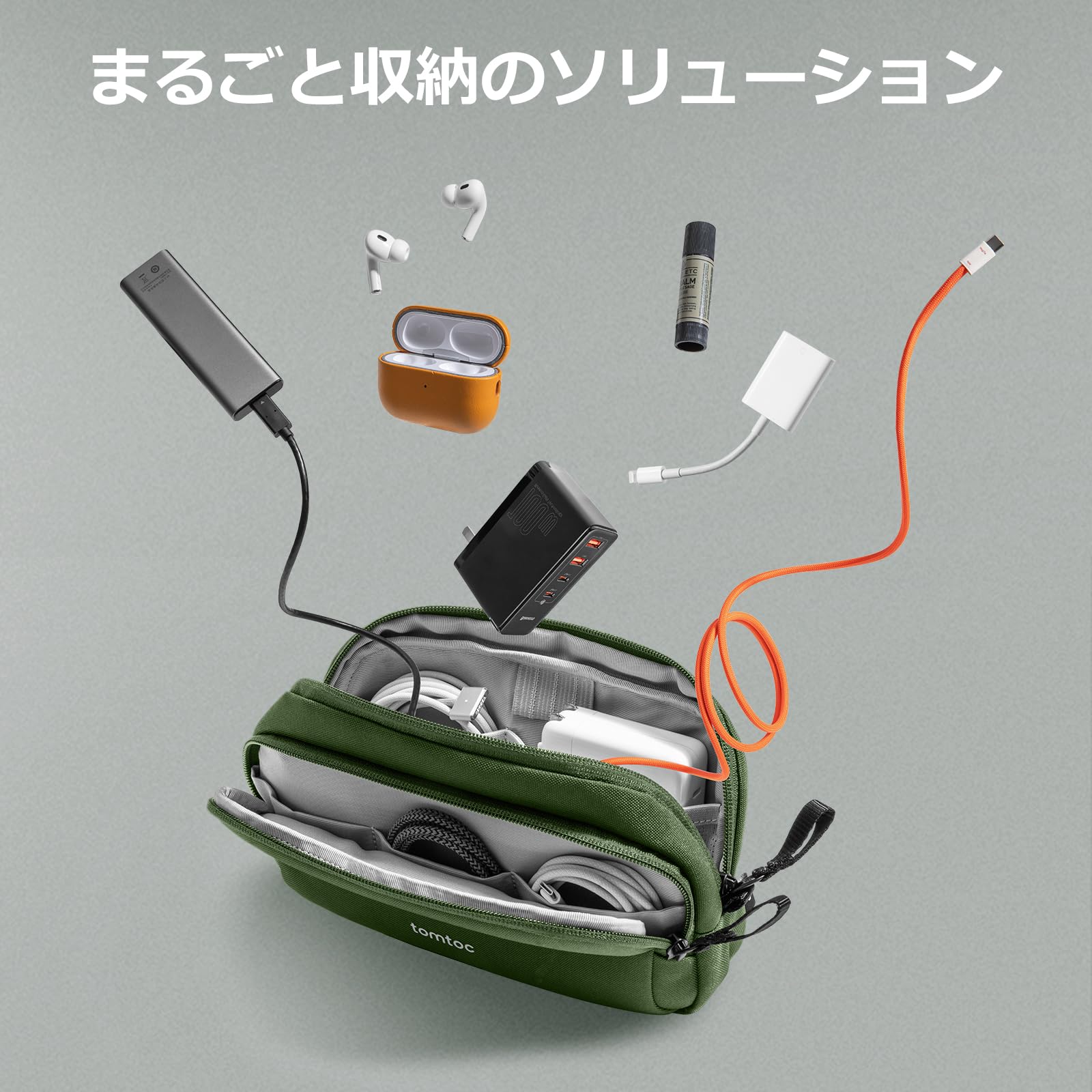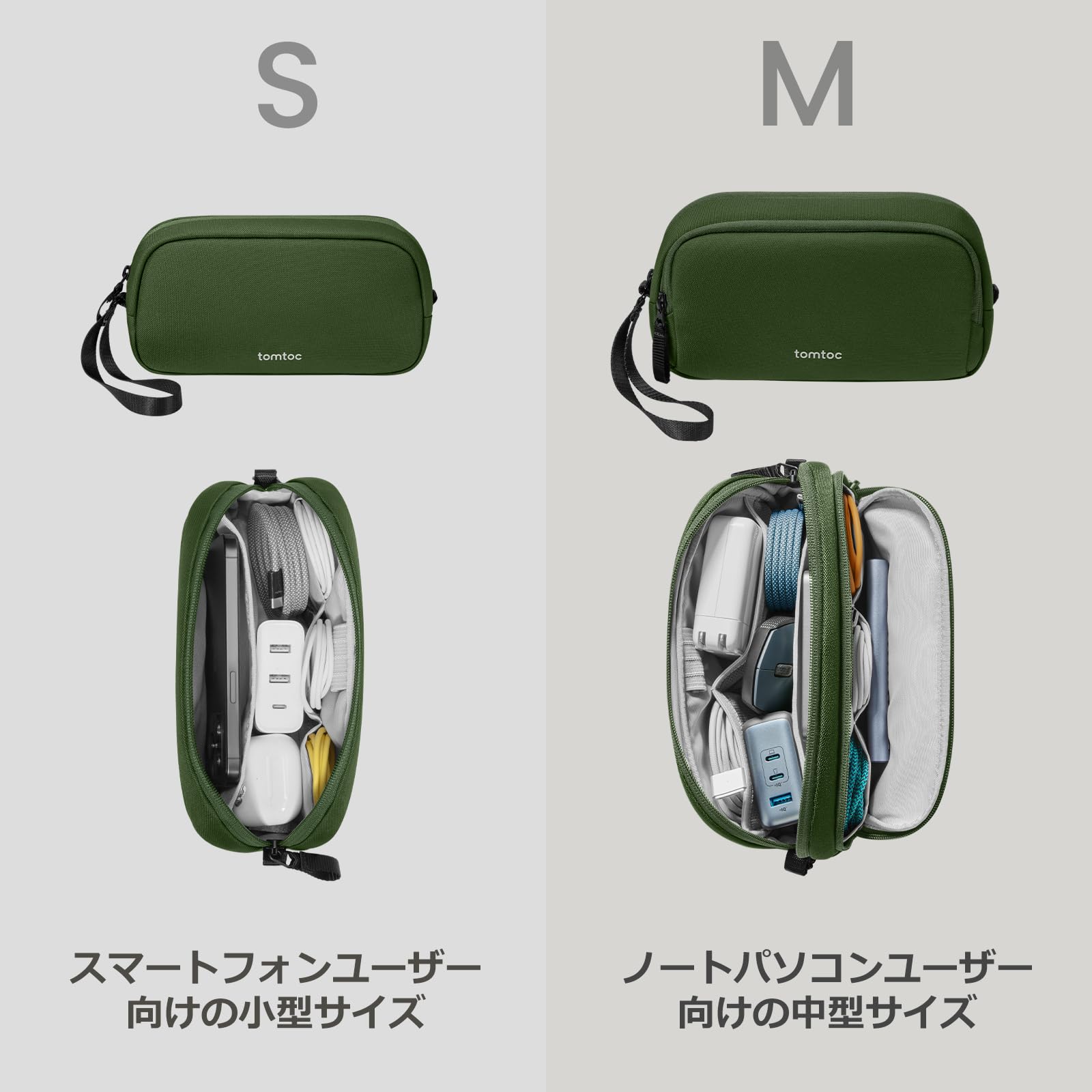 tomtoc ガジェットポーチ 大容量 トラベルポーチ PC周辺小物収納ポーチ 小物入れ バッグ ケース ケーブル アダプタ モバイルバッテリー マウス収納 出張 お出掛け オフィス 旅行 便利グッズ バックインバッグ 二層 自立 撥水 軽量 グリーン