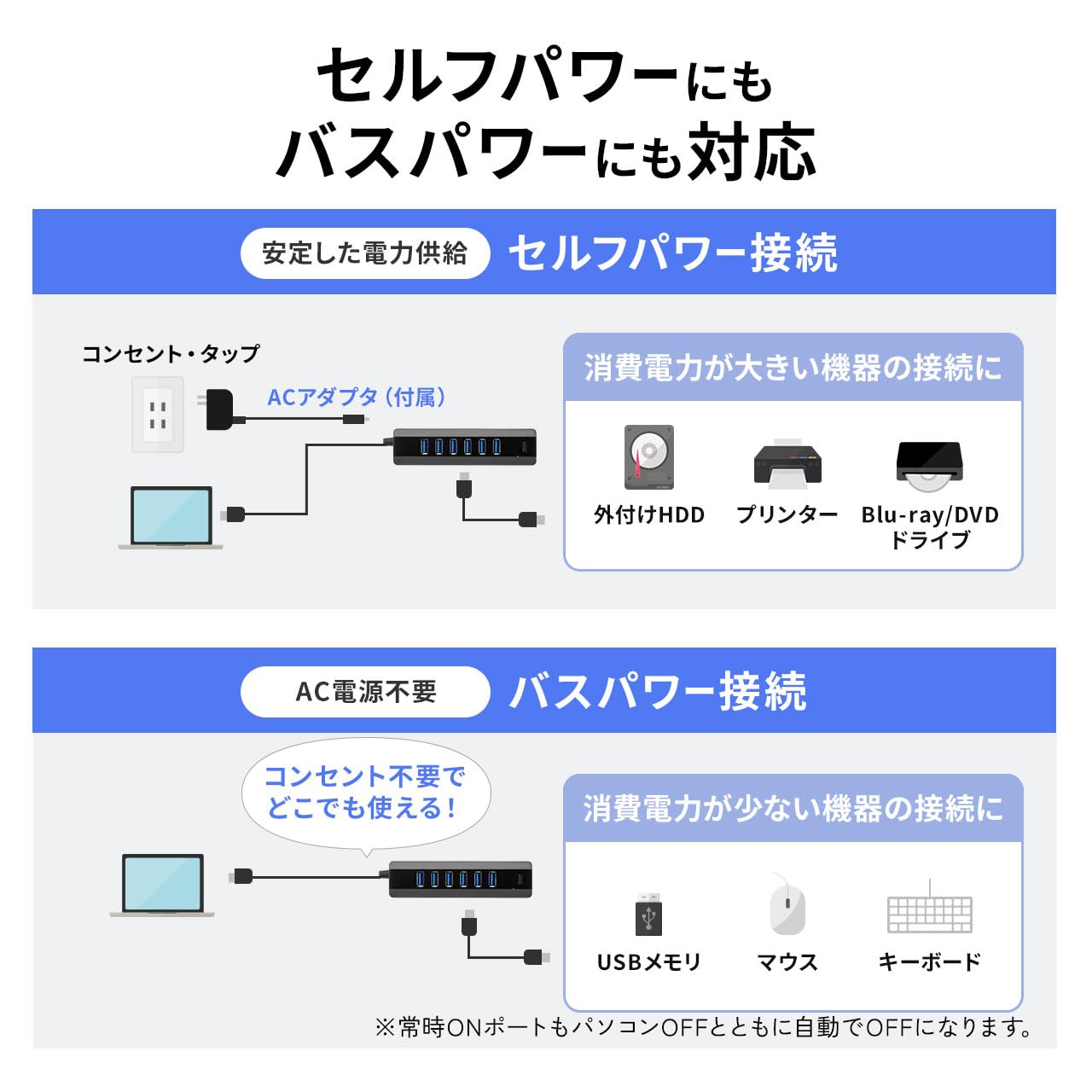 * USB機器 を最大7台接続できるUSB 5Gbps ( USB3.2 Gen1)対応の7ポート USB Aハブ です。 パソコン の 電源 状態に合わせて自動的に電源が切れる便利なハブです。