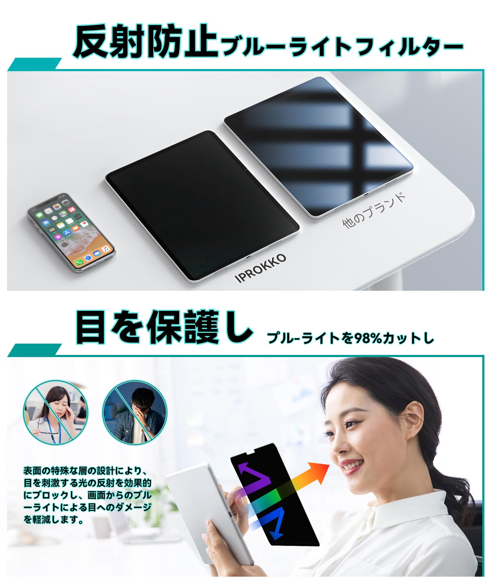 * 【目の保護】弊社の製品はiPad 360度覗き見防止フィルムだけでなく、アンチグレアブルーライトiPad保護フィルムでもあります、グレアブロック加工により反射を軽減し、画面の映り込みを防ぎます。また、ブルーライトを約68%、紫外線を約99.9%カットし、長時間画面を使用する人の目を有害な光線から守るのぞき見防止フィルムです。