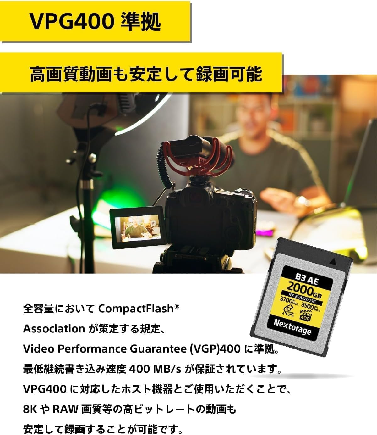 * VPG400対応: CompactFlash Associationが策定する規定、Video Performance Guarantee (VGP)400に準拠しており、最低継続書き込み速度400 MB/sが保証されています。